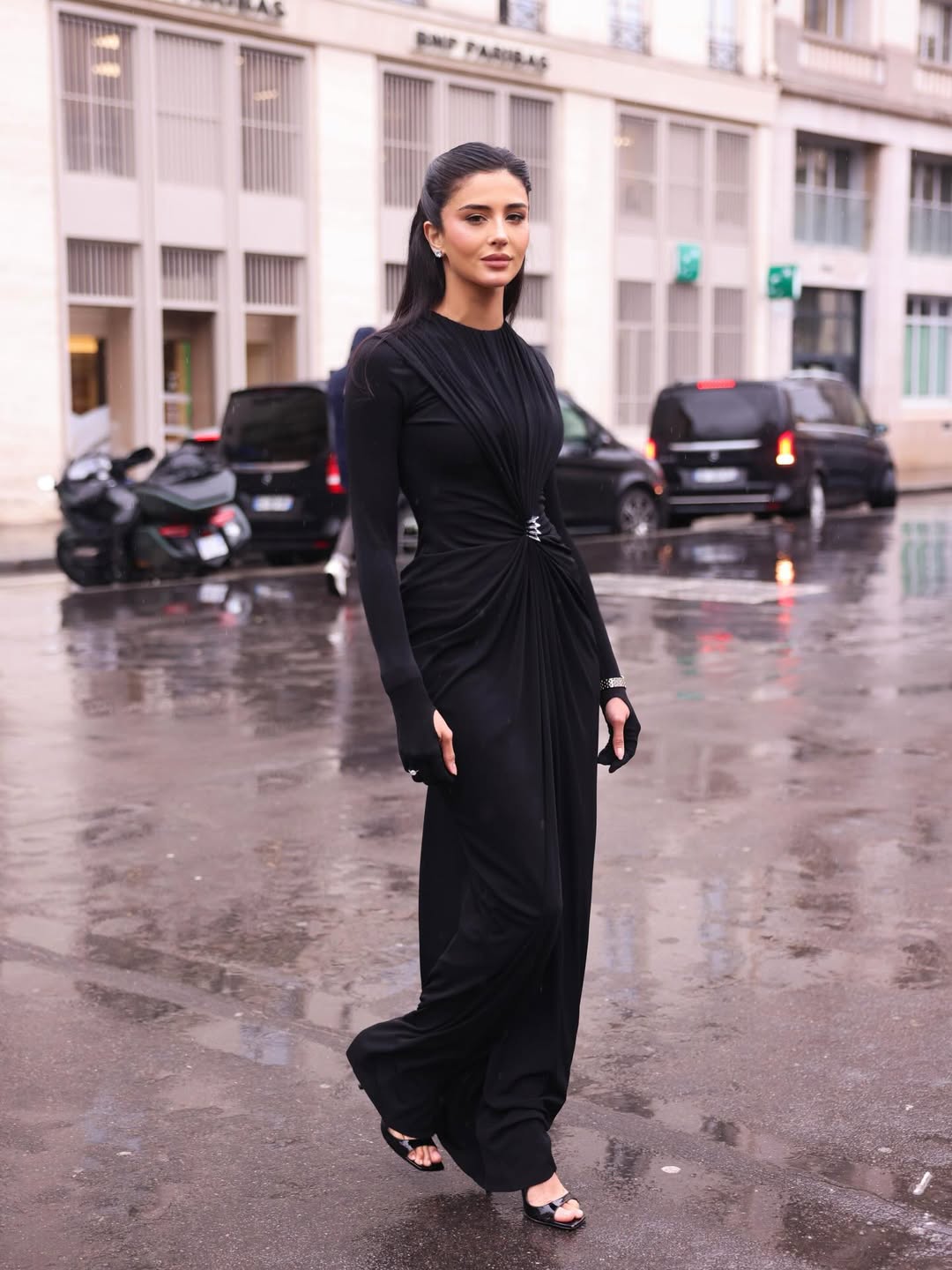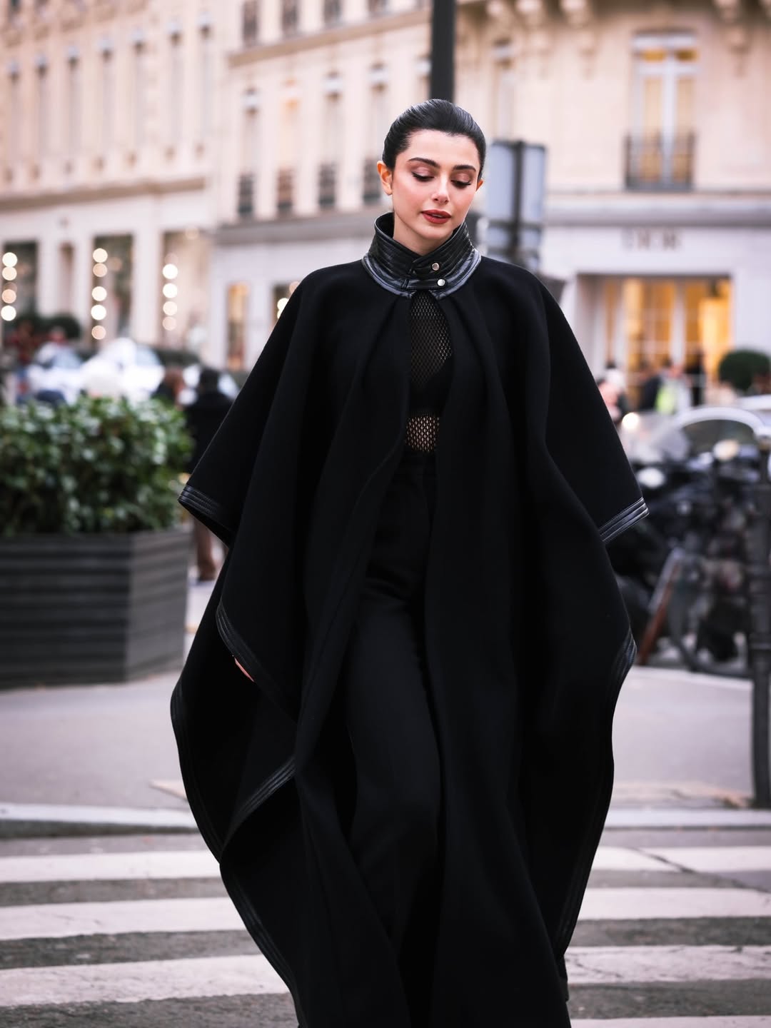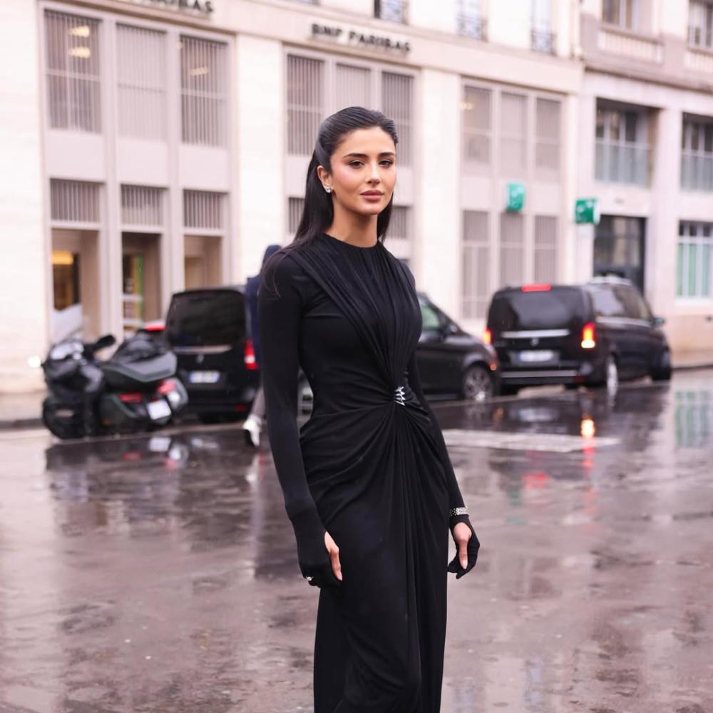 ريم السعيدي اختارت إطلالة مونوكروم سوداء لحضور عرض إيلي صعب، تألفت من تنورة ماكسي واسعة بخصر عالٍ وقميص بأكمام طويلة مفتوحة، مع معطف صوفي طويل وبوت عالٍ، في تنسيق صباحي أنيق يعكس فخامة هادئة.