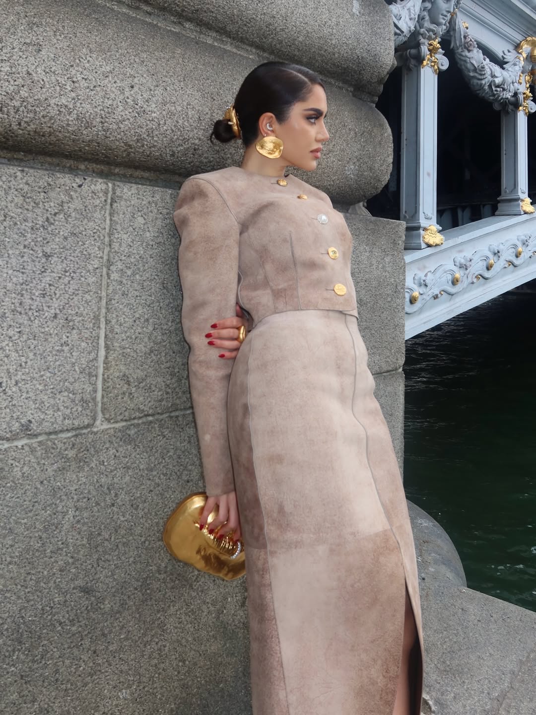 نجود الرميحي لفتت الأنظار بإطلالة محتشمة من المخمل البني الشاحب، تألفت من تنورة ماكسي بقصة بنسل مع ذيل خلفي وتصميم مفتوح من الأمام، نسقتها مع جاكيت مجسم مزين بأزرار معدنية ذهبية. وأكملت اللوك بحقيبة ذهبية وبوت كاحل مخملي بمقدمة معدنية، في تنسيق مثالي للأجواء الباردة وأيام رمضان المعتدلة.