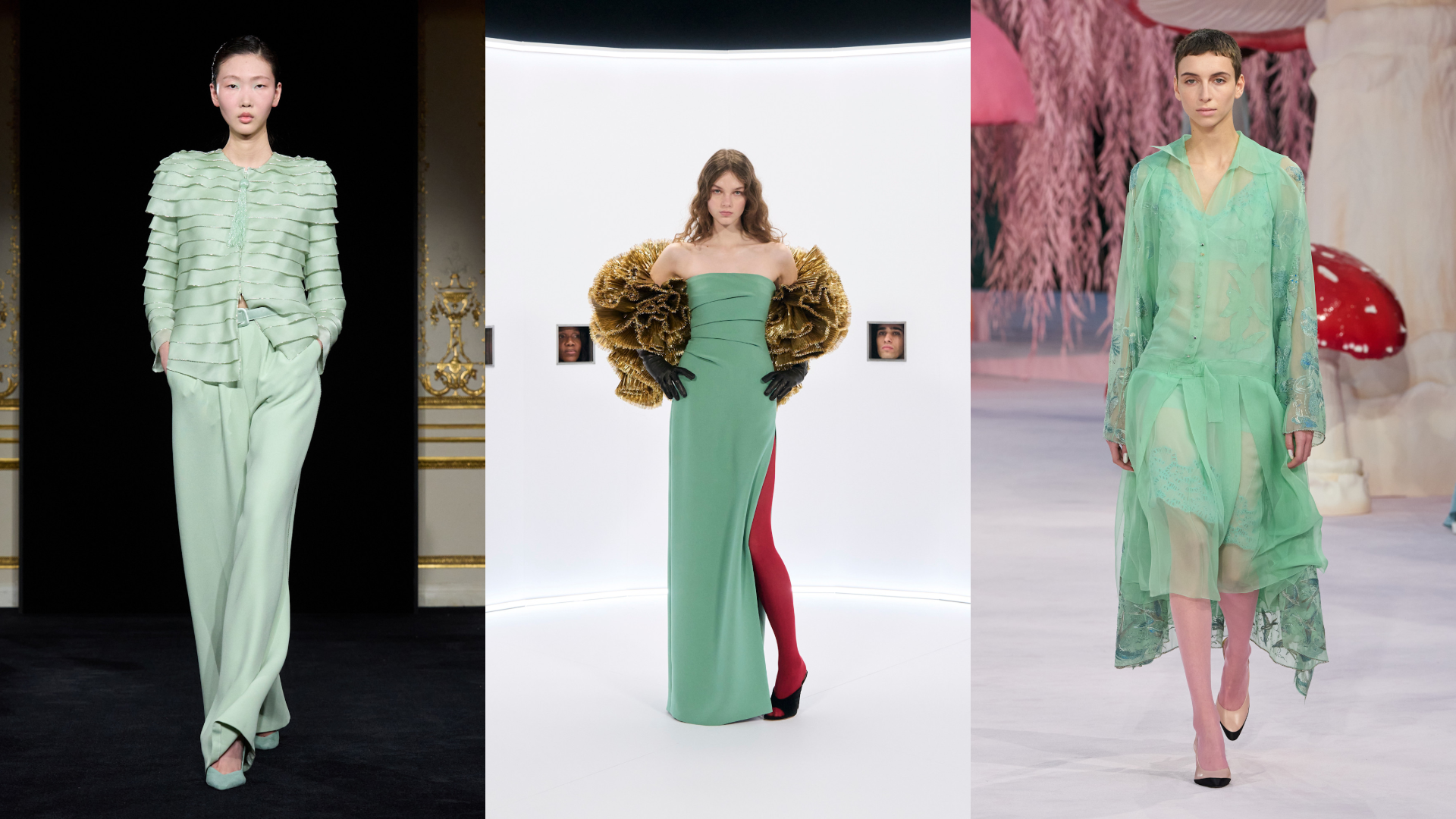 رغم اختلاف الرؤى الإبداعية، برز اللون الأخضر النعناعي كخيط مشترك جمع بين معظم العروض. في أرماني بريفيه، ظهر اللون عبر الأورجانزا، والتطريز بالخرز، والحرير، وحتى أقمشة البدلات.