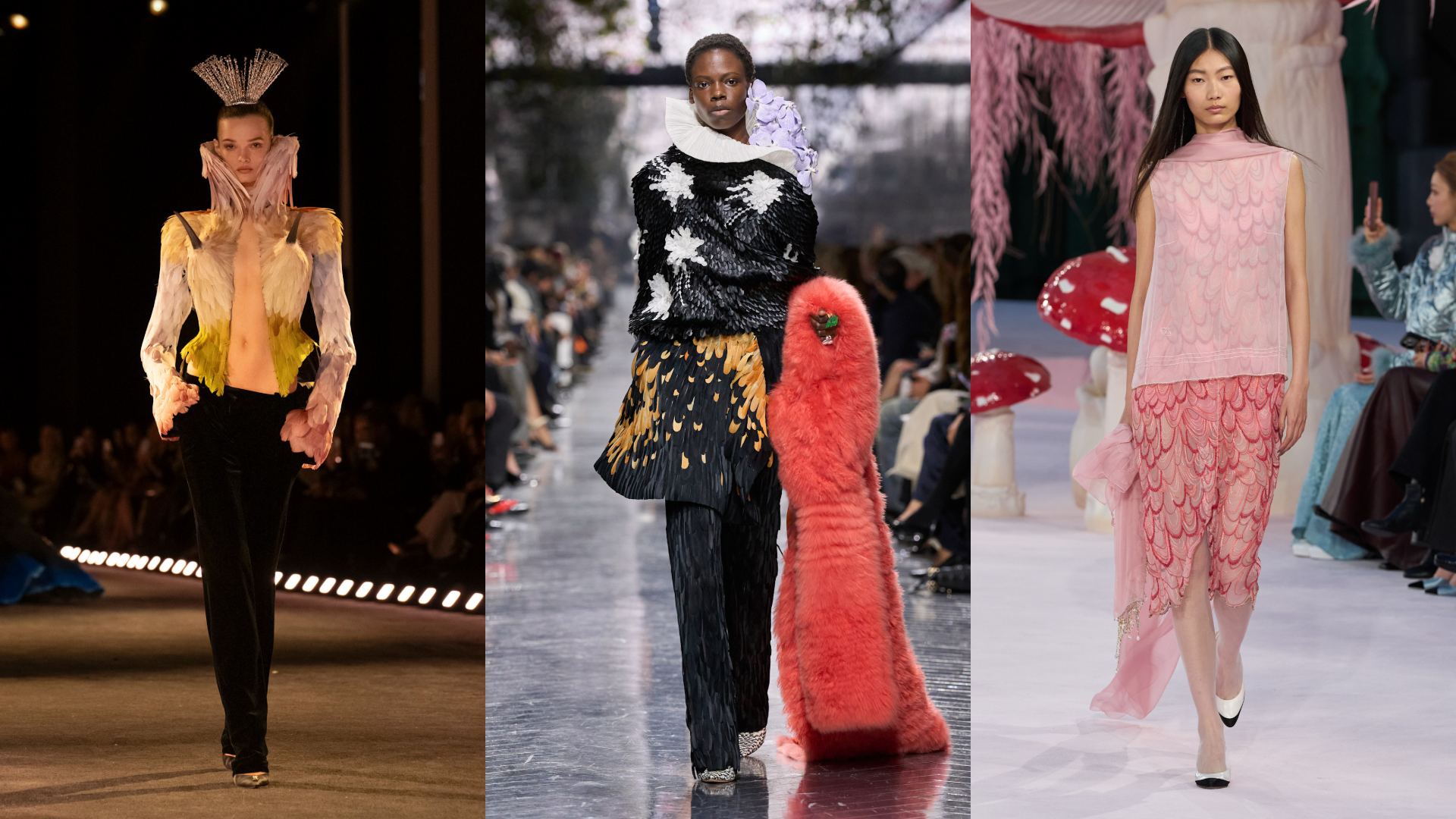وفي أول ظهور له مع ديور، لجأ جوناثان أندرسون إلى رموز الطبيعة، فبدت الأقمشة كفراء طيور ناعمة، بينما بلغت الدراما ذروتها في سكياباريللي، حيث ظهر جاكيت مصنوع بالكامل من الريش، في استعراض جريء للقوة والخيال.