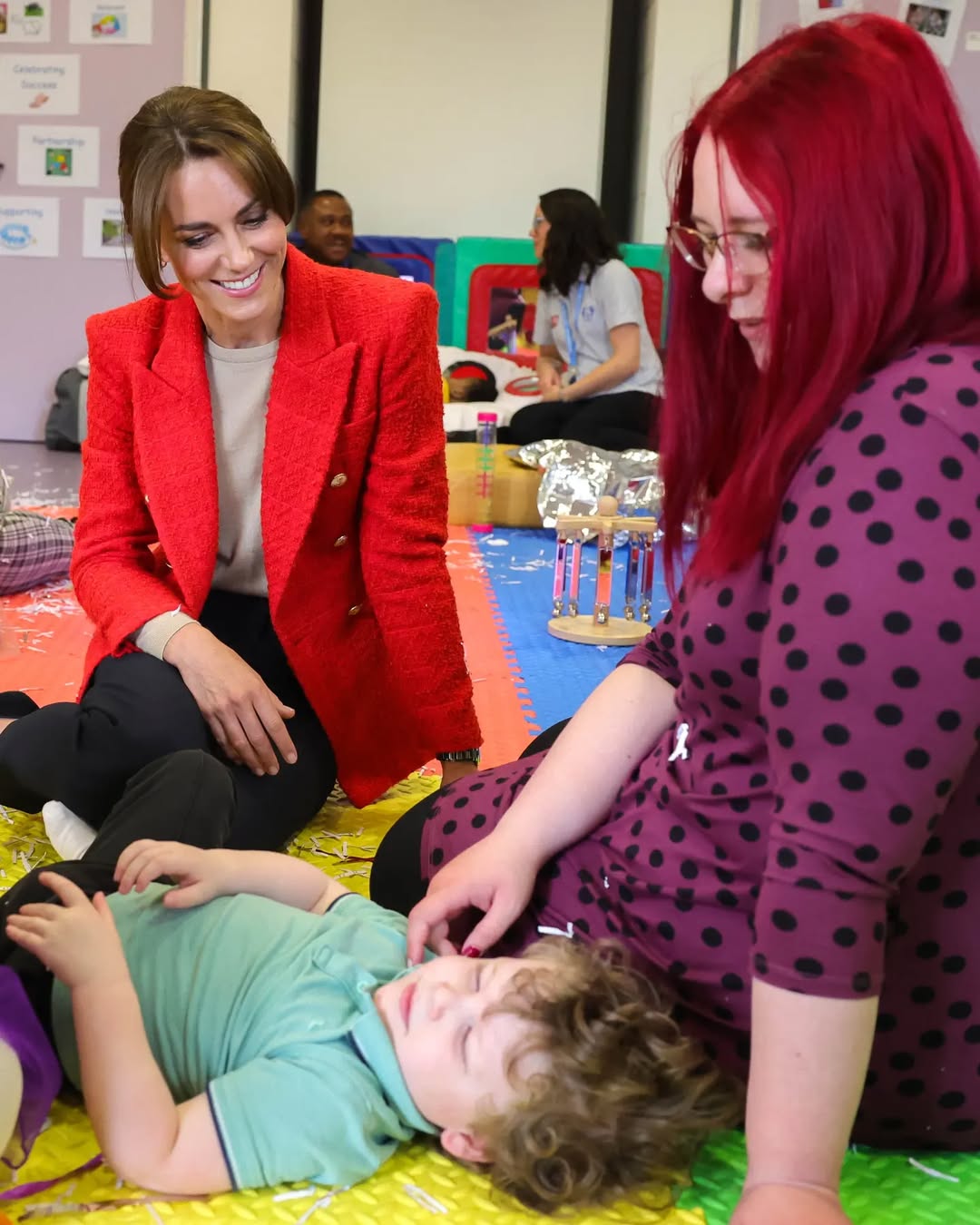 لم تقتصر اختيارات كيت على المعاطف فقط، بل تألقت أيضًا ببدلة كلاسيكية باللون الأحمر، جاءت بتصميم بسيط وأنيق، مع بليزر متوسط الطول وسروال مستقيم. هذا اللوك أكد أن الأحمر قادر على أن يكون رسميًا بامتياز عندما يُقدم بخطوط نظيفة وتفاصيل هادئة.
