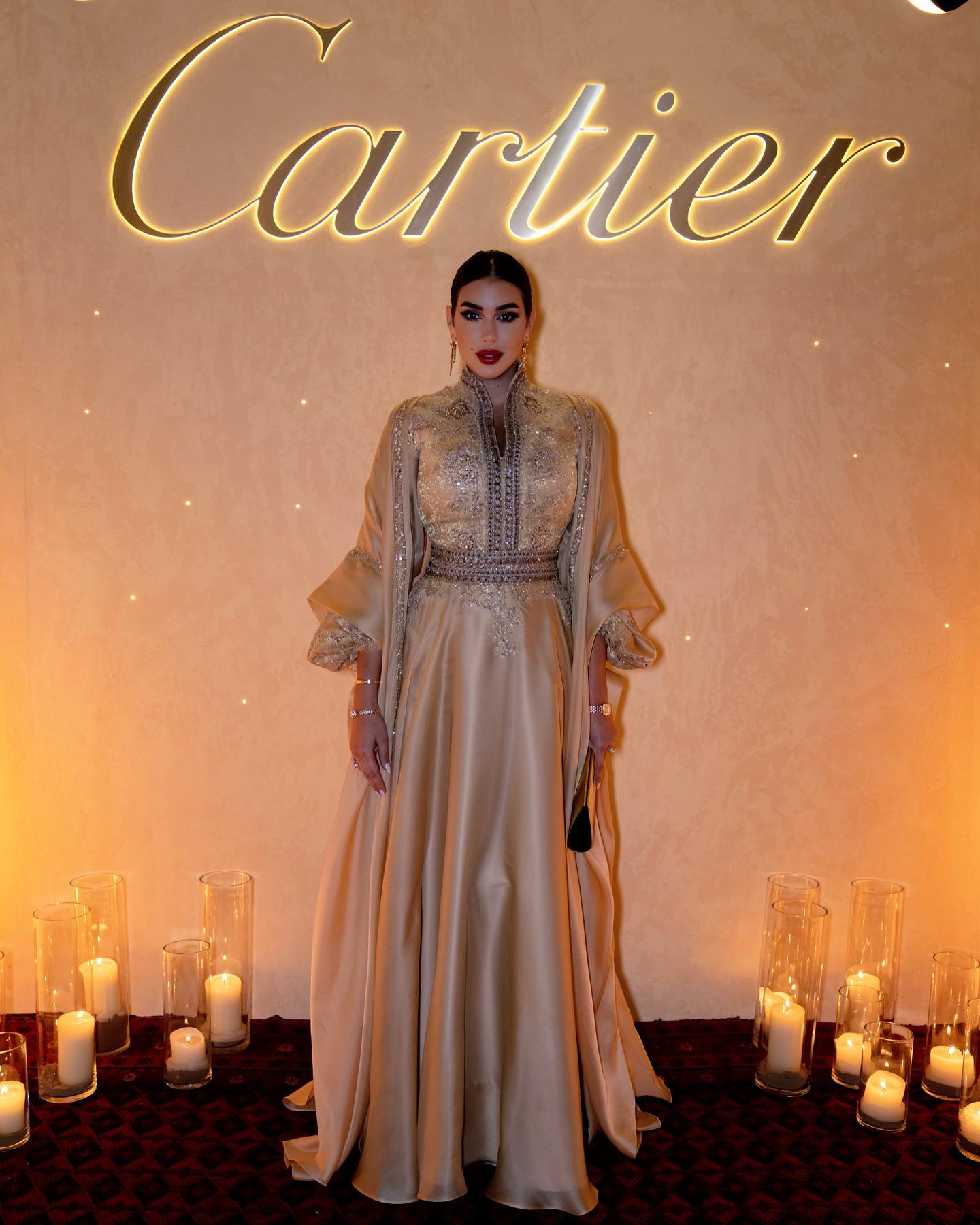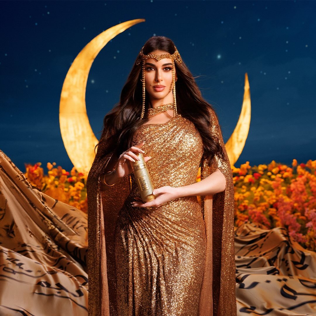 كما تألقت بفستان ذهبي لامع بتصميم انسيابي ينسدل برقي حول القوام، مزين بتفاصيل براقة تعكس الضوء بنعومة. الكاب الطويل المنسدل من الكتفين منح الإطلالة طابعًا ملكيًا، بينما عززت الإكسسوارات الذهبية والتاج الناعم من فخامة اللوك، ليكون خيارًا مثاليًا لسهرات رمضان الخاصة.