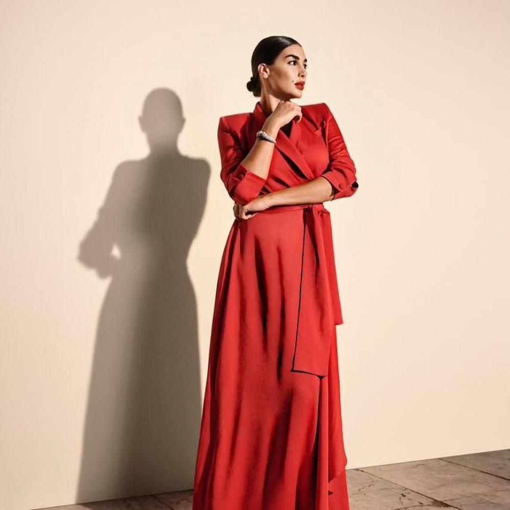 كما اختارت فستانًا أحمر موحد اللون بتصميم ناعم، تميز بياقة مثنية وأكمام متوسطة الطول مع حزام معقود حول الخصر، وانسدل بقصة واسعة أنيقة. واكتملت الإطلالة بقطعة مجوهرات فاخرة أضافت لمسة فخامة راقية.