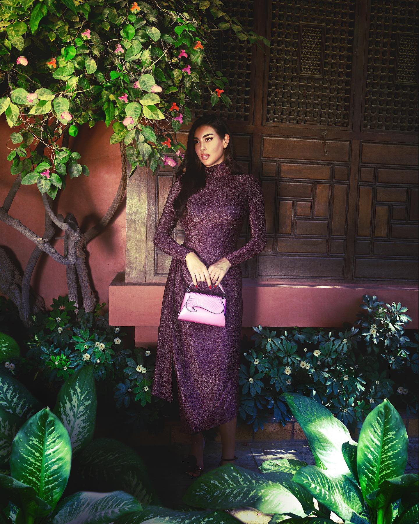 وفي ظهور آخر على السجادة الحمراء، اختارت فستانًا مخمليًا بتدرجات الزهري والبنفسجي الداكن، تميز بأكمام طويلة وياقة مربعة وخصر محدد. التطريزات اللامعة بالورود ثلاثية الأبعاد أضفت لمسة فنية راقية، فيما جاءت القصة المستقيمة للفستان مناسبة لأمسيات رمضان الرسمية والعائلية.