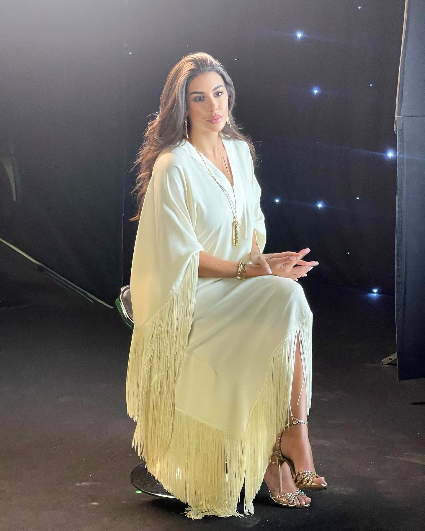 وفي إطلالة أخرى، اعتمدت عباية كريمية فضفاضة بتصميم طويل وأكمام على شكل وشاح، مع فتحة رقبة على شكل حرف V. الشراشيب الطويلة التي زينت أطراف الزي والأكمام أضفت حركة أنيقة، فيما عزز الصندل الذهبي والإكسسوارات المتناسقة من جمال الإطلالة.