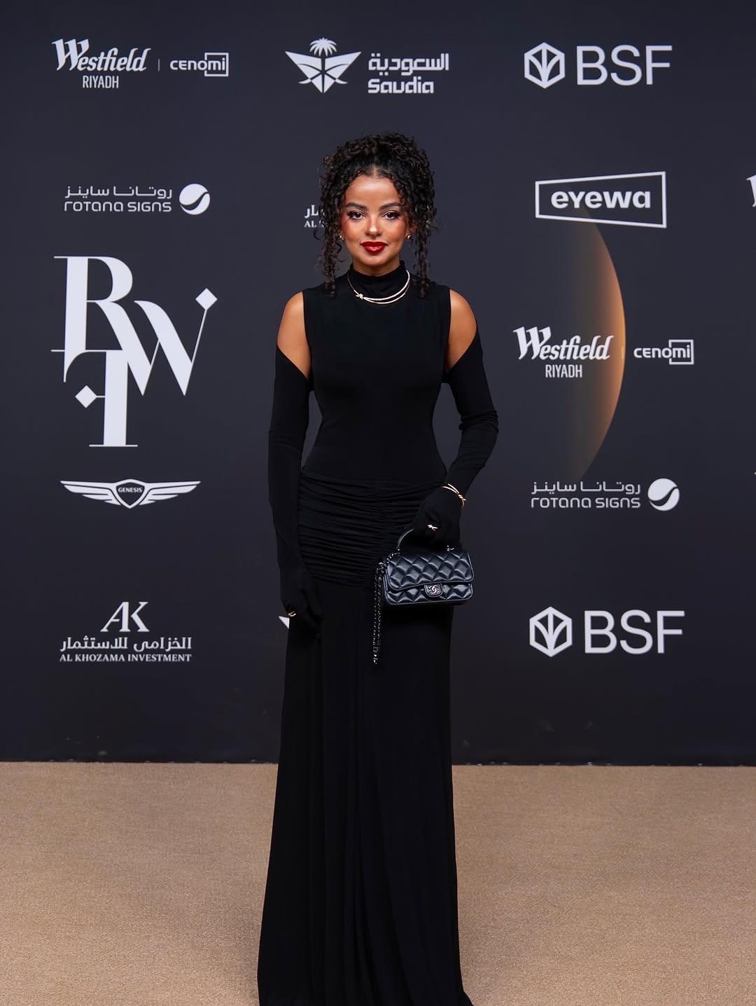 قدّمت الإعلامية السعودية أجواء الجودي مثالًا راقيًا للأناقة الهادئة، من خلال فستان أسود طويل بقصة عالية الرقبة وبدون أكمام، تميز بتكسيرات ناعمة في الجزء السفلي. القفازات السوداء الطويلة أضافت بُعدًا كلاسيكيًا واضحًا، مع حقيبة صغيرة أنيقة أكملت الإطلالة بأسلوب مثالي لسهرة عيد الحب.