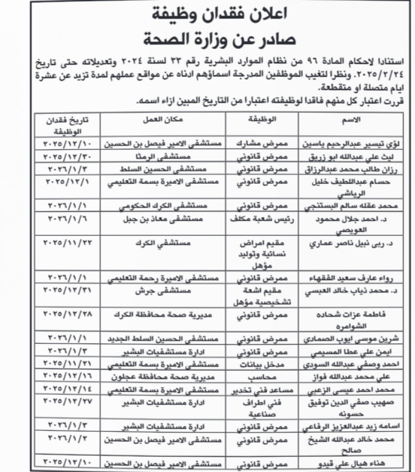 للعلّم - أعلنت وزارة الصحة عن أسماء عدد من الموظفين فقدوا وظائفهم لتغيبهم عن العمل بدون سبب أو عذر.