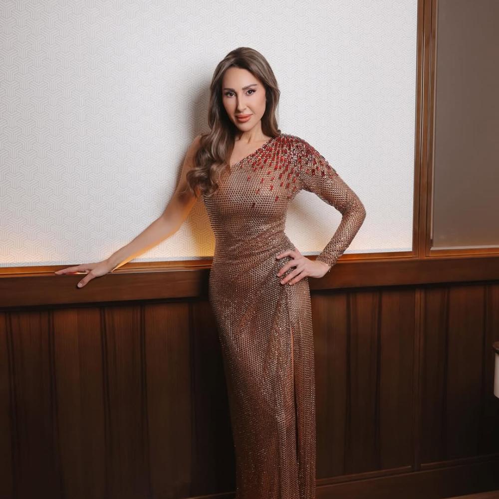 النجمة أحلام اختارت لونًا نحاسيًا مائلًا إلى البرتقالي الدافئ في فستان فخم من تصميم زهير مراد. تميز التصميم بتطريزات كثيفة من الخرز والكريستال بأسلوب هندسي يركز على الخصر، مع أكمام شفافة مطرزة وسلاسل لامعة على الصدر أضافت بعدًا مسرحيًا أنيقًا، مع الحفاظ على الانسيابية التي تميز أسلوب المصمم.