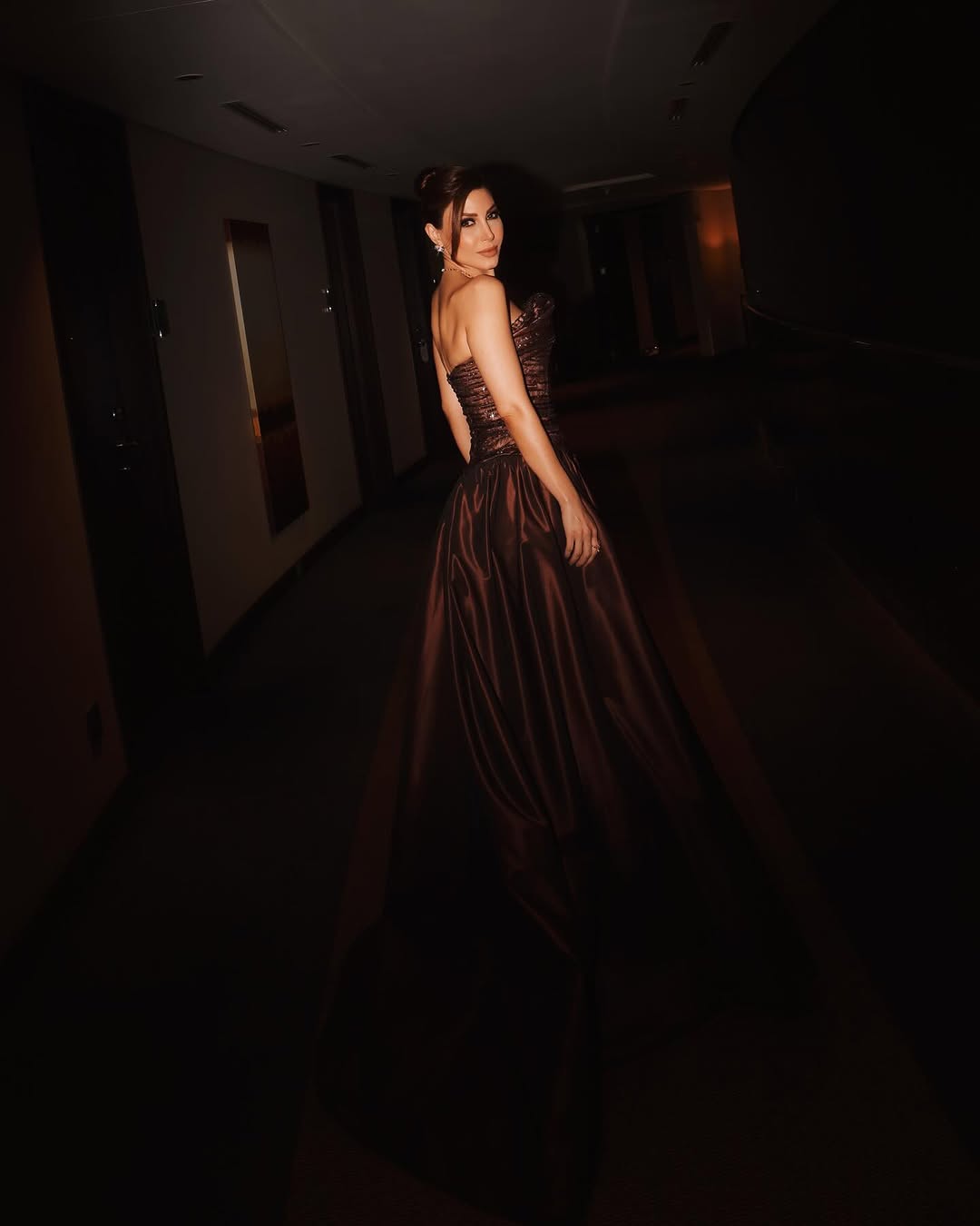 النجمة اللبنانية يارا تألقت بإطلالة لافتة خلال ظهورها في دبي، حيث اختارت فستان سهرة باللون البني الداكن المائل إلى البرونزي من توقيع Eli the Label. جاء التصميم بقصة كورسيه منحوتة عند الصدر ومزينة بالترتر اللامع، مع تنورة ساتان واسعة بكسرات عريضة منحت الإطلالة طابعًا ملكيًا. واكتملت الأناقة بمجوهرات ألماسية وتسريحة شعر مرفوعة ناعمة، مع مكياج سموكي بدرجات ترابية عزز من دفء الإطلالة.
