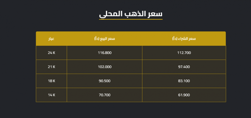بلغ سعر بيع غرام الذهب عيار 21 في السوق المحلية، 102 دينار لغايات البيع من محالّ الصاغة، مقابل 97.40 دينارا للشراء.