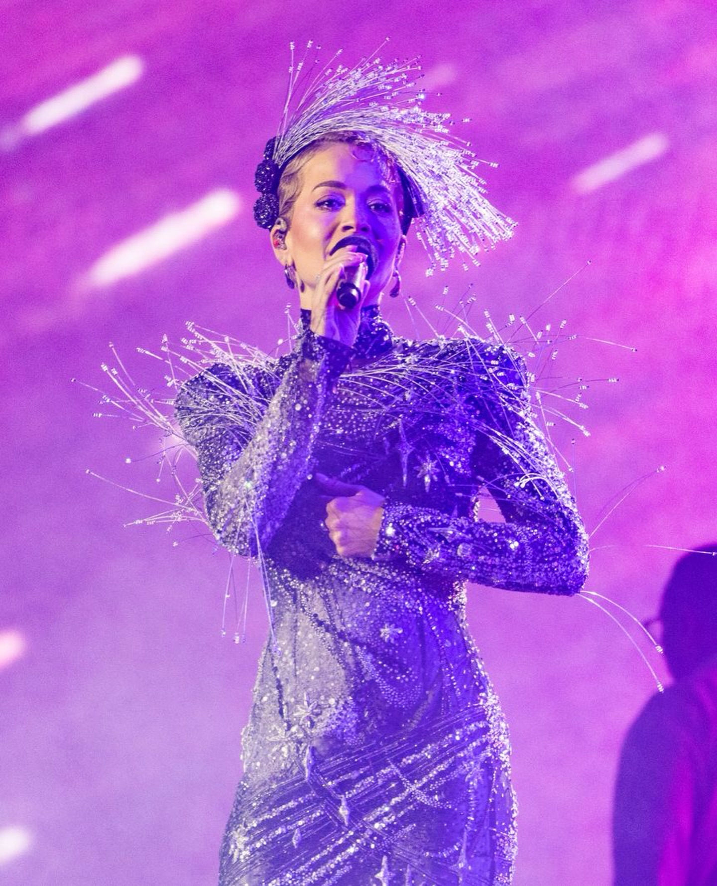 في افتتاح ألعاب الماسترز على ستاد مدينة زايد الرياضية، خطفت ريتا أورا الأنظار بفستان أسود وفضي لامع جاء بقصّة ضيقة وأكمام طويلة وياقة عالية، ما منح الإطلالة طابعًا محتشمًا مع حضور قوي. التطريزات المعدنية الهندسية عكست الضوء بأسلوب فني مدروس، بينما أضاف التاج الفضي المستقبلي بعدًا دراميًا يليق بحفل افتتاح ضخم.