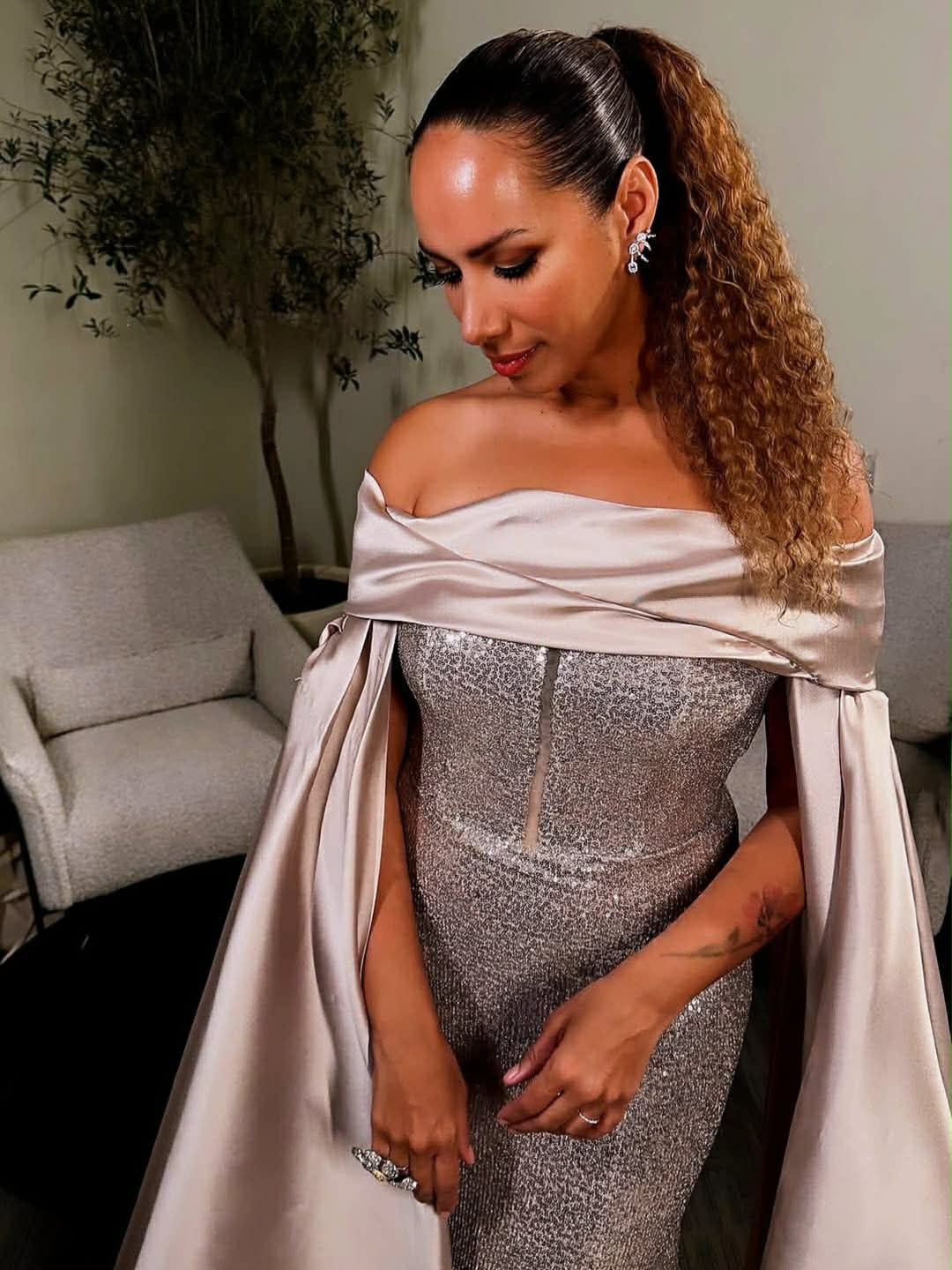 ليونا لويس اختارت تصميمًا انسيابيًا بتدرجات الفضي والشمباني من مجموعة “She Is Now” للمصممين خالد ومروان. الفستان عكس فلسفة الأنوثة الهادئة، حيث امتزجت التطريزات الدقيقة مع أكمام وتصميم محافظ منحها حضورًا راقيًا دون مبالغة. إطلالة تؤكد أن البريق لا يحتاج إلى جرأة زائدة ليكون لافتًا.