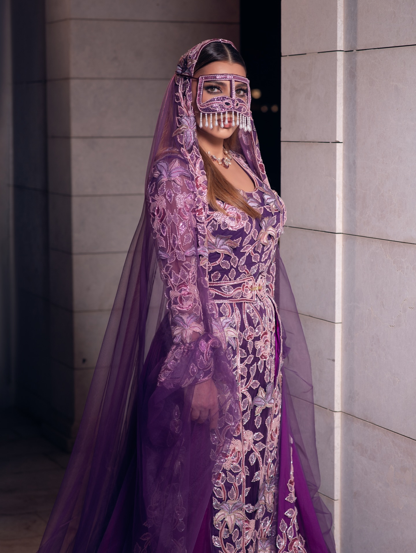 على مسرح خورفكان، قدّمت أصالة إطلالة ملكية بتوقيع Hamad Jasem، بفستان بنفسجي مطرز بالكامل بتفاصيل زهرية دقيقة. الأكمام الشفافة الواسعة وطبقة التل المنسدلة من الكتفين أضفت بعدًا دراميًا راقيًا، فيما أكمل التاج الذهبي والبرقع التقليدي الطابع التراثي الفاخر. حضور يدمج الأصالة بالمعاصرة دون أن يفقد هويته.