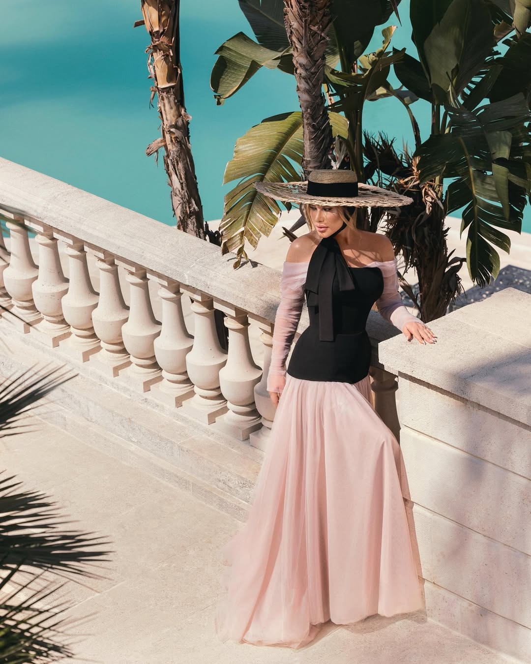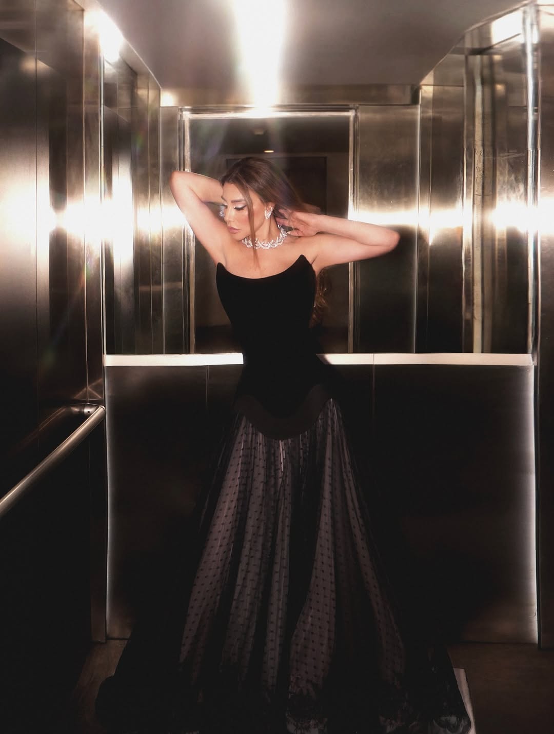 هذا التصميم ينسجم مع قوامها الرشيق، فيبرز الخصر ويمنحها وقفة واثقة على المسرح. كما أنه يتيح تنويع الخامات والألوان بين المخمل والحرير والميتاليك، ليبقى العنصر الثابت هو الخط المنحوت الذي يعزز حضورها.