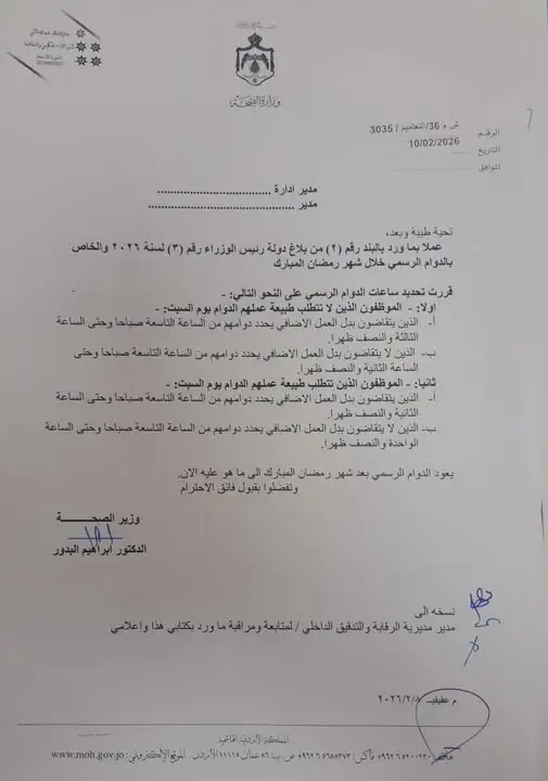 يهدف هذا القرار إلى تنظيم سير العمل في المرافق الصحية ومبنى الوزارة بما يتناسب مع خصوصية شهر رمضان، مع ضمان استمرار تقديم الخدمات الطبية للمواطنين بكفاءة عالية.