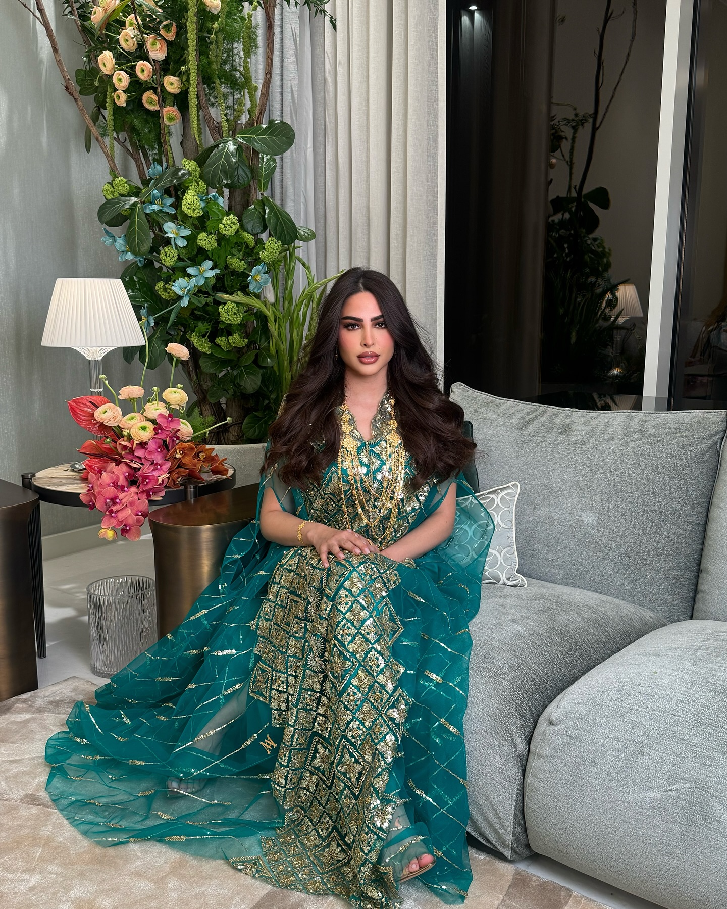 تألقت بقفطان أخضر زمردي مزين بتطريزات ذهبية هندسية. طبقات القماش الشفافة أضافت خفة وأناقة، لتمنح الإطلالة توازنًا بين الفخامة والنعومة.