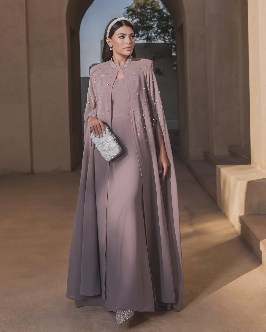 قدمت تصاميم هادئة من تعاونها مع Max Fashion MENA، منها فستان نيود مع كاب طويل مزين بترتر وكريستال ناعم. كما اعتمدت عباية مفتوحة أوفرسايز مطرزة بهلال لؤلؤي من Sarah's Bag، ونسّقتها مع حقيبة من Bottega Veneta.