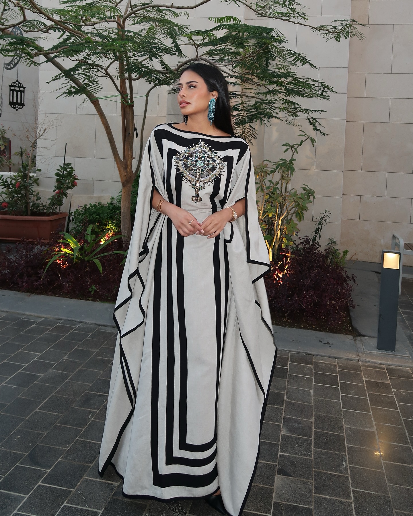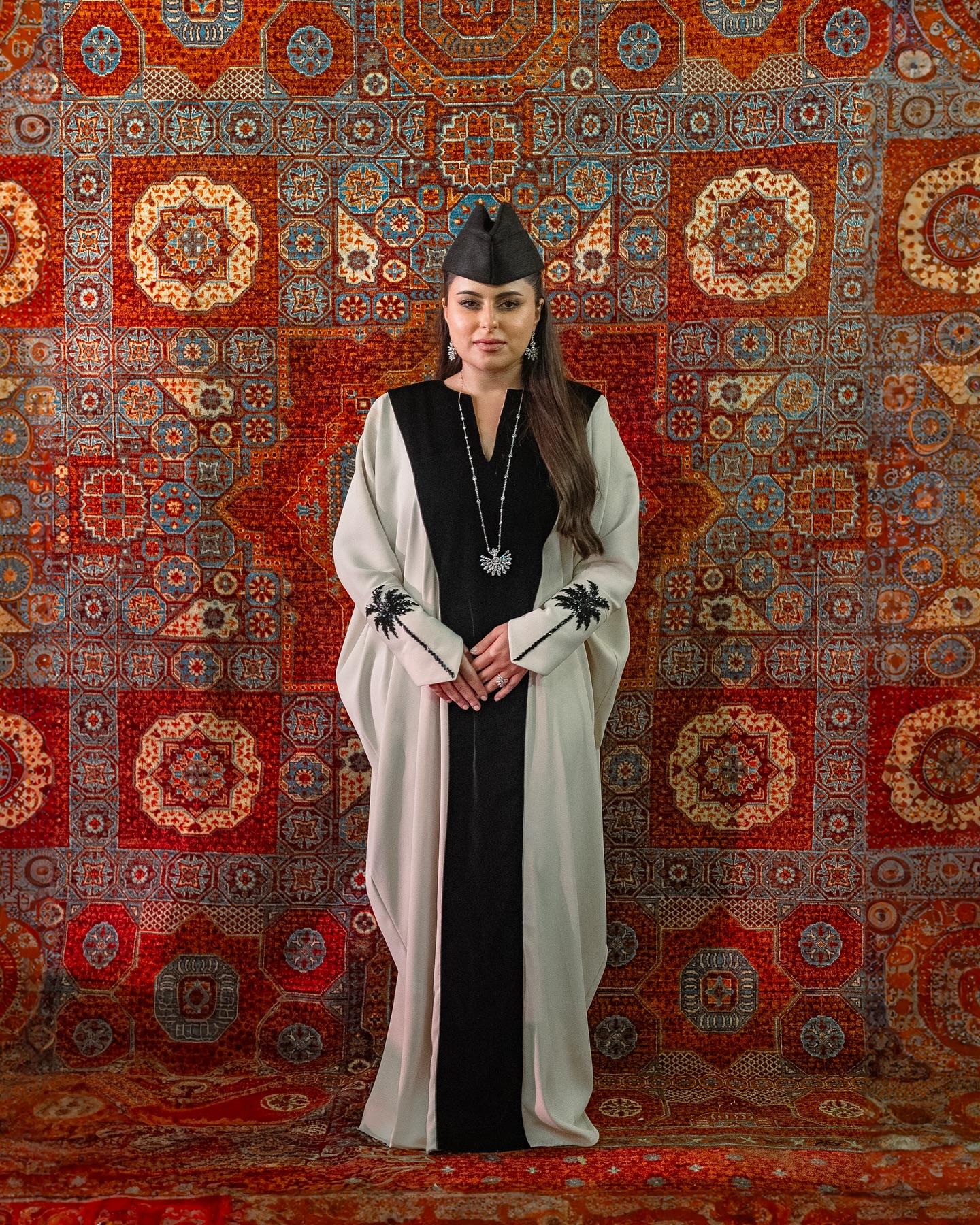 ظهرت بعباءة سوداء وعاجية بقصة واسعة، مزينة بنقوش نباتية عند الأكمام. أضاف العقد الفضي الطويل والقبعة الصغيرة طابعًا تراثيًا أنيقًا يليق بالأمسيات الرسمية.