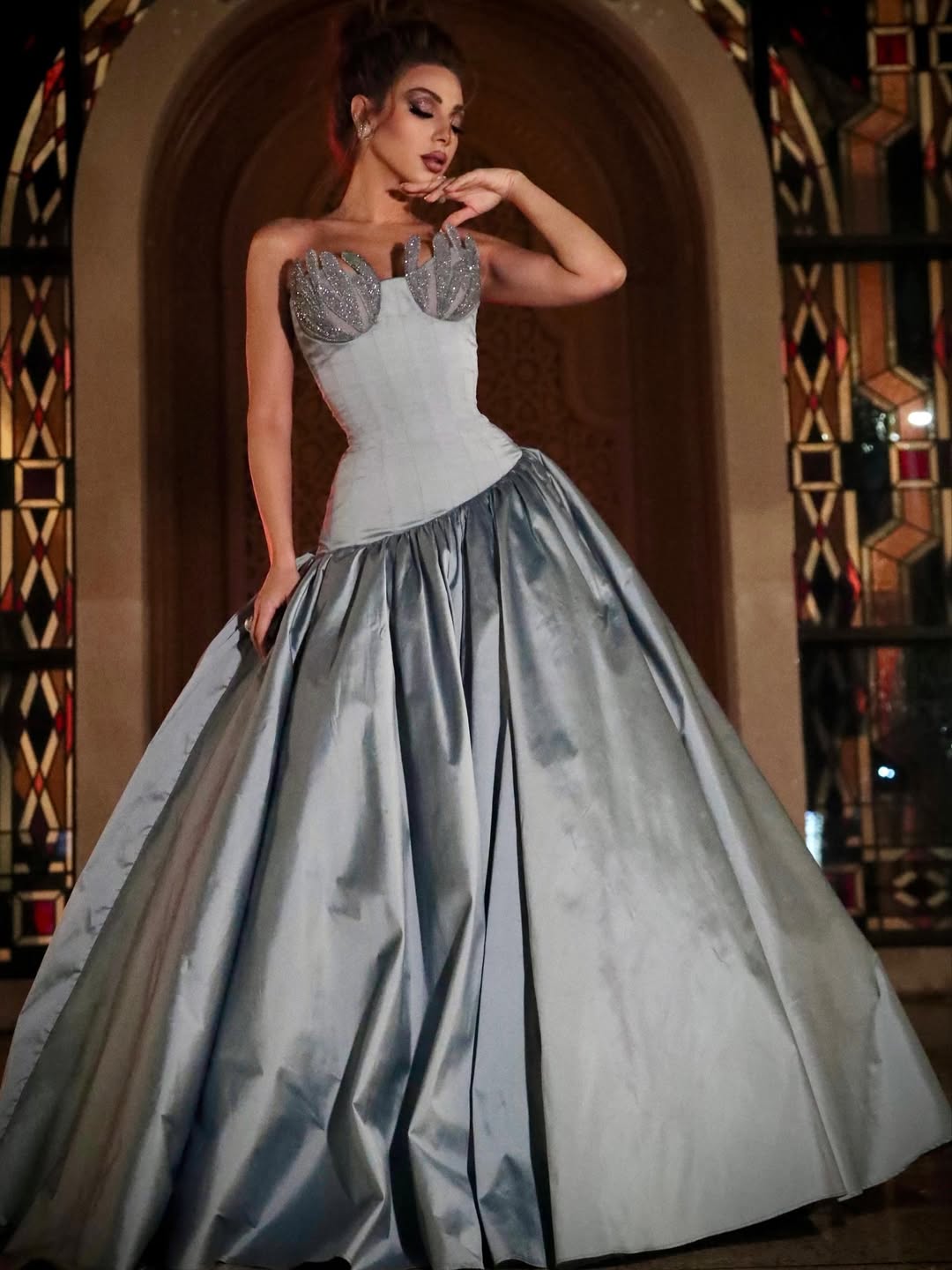 بعيدًا عن أضواء الحفل، تميل ميريام مؤخرًا إلى فساتين السهرة الحالمة. فقد تألقت بفستان أزرق شاحب منفوش من توقيع Bendy Bark، بكورسيه مشدود وقصة سترابلس، وانسدل الحرير بأسلوب أميري واضح، واكتفت بمجوهرات من Yeprem لتكمل المشهد.