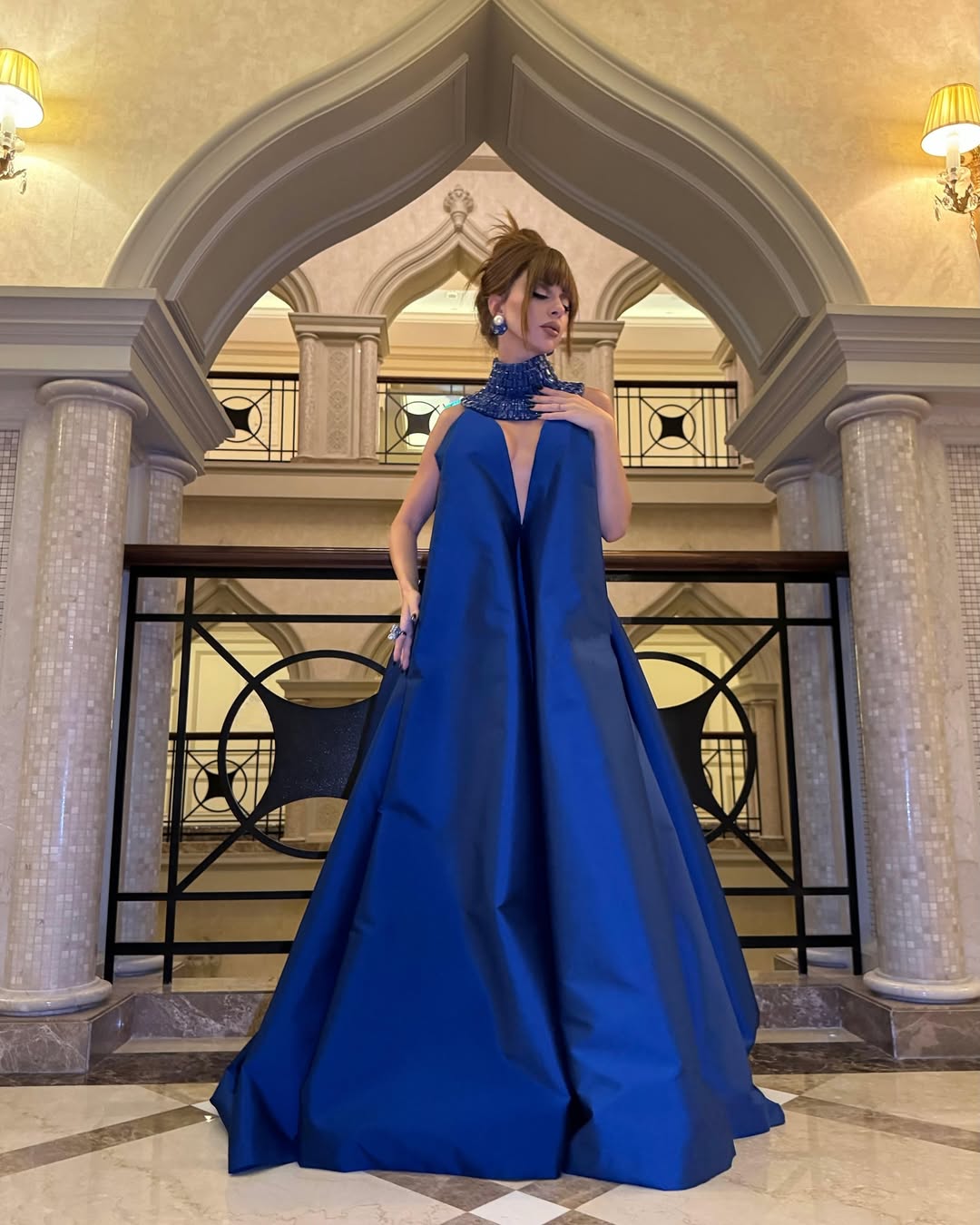 كما أطلت بفستان أبيض طويل من توقيع Edmond Moussallem، بحمالات تل شفافة وكورسيه حريري مطرّز بالكريستال، تليه شرائط تل متناثرة تمنح التنورة حجمًا خفيفًا. واعتمدت أيضًا من الدار نفسها فستانًا أزرق ملكيًا بياقة عالية مرصعة وفتحة جريئة، مع ثنيات عريضة وقصة فضفاضة عززت فخامته.
