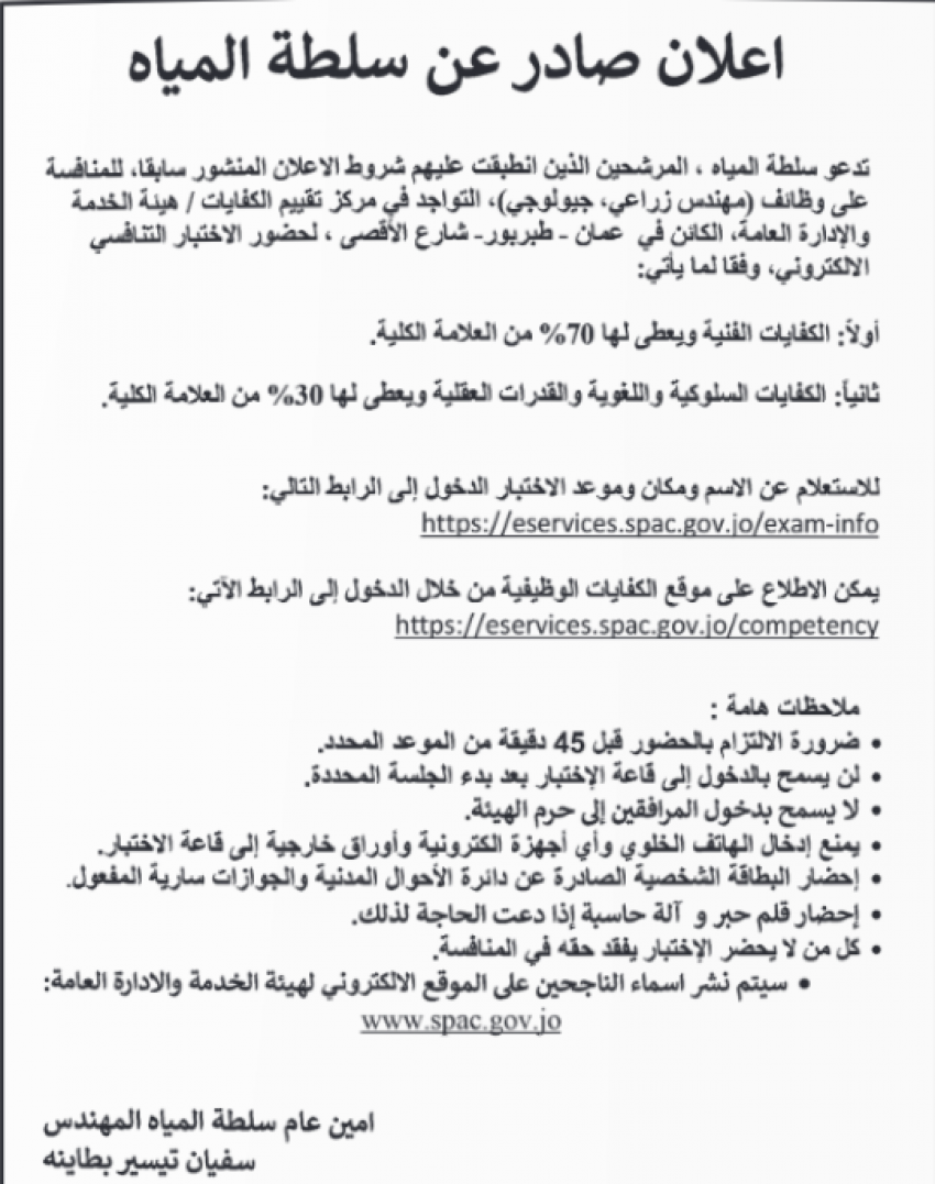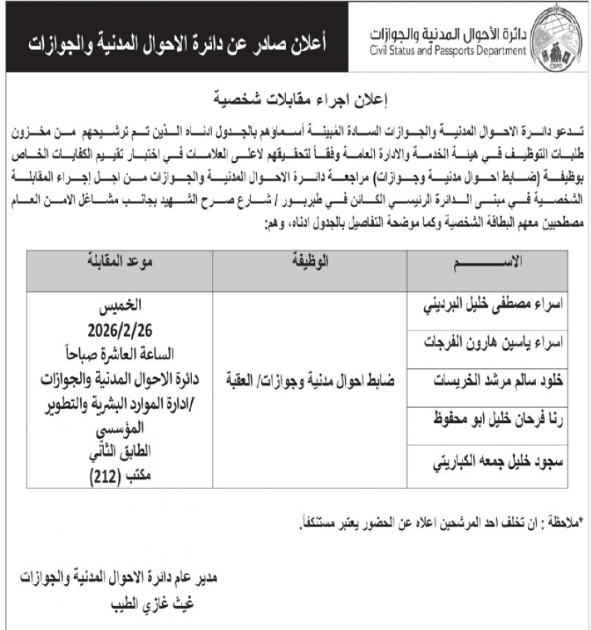للعلّم - دعت دوائر حكومية اليوم الاربعاء، عددًا ممن اجتازوا امتحانات الكفايات لإجراء المقابلات لغايات التعيين.