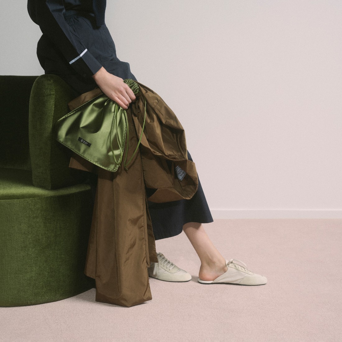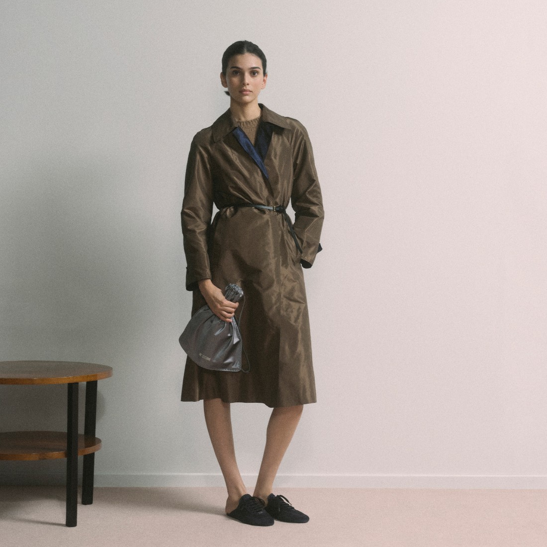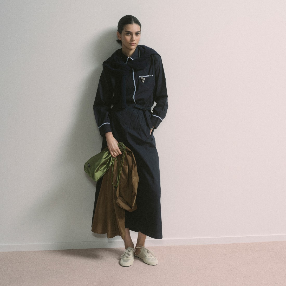 تتألق الأقمشة اللامعة والنسيج الفاخر ببريق رقيق ينسجم مع أجواء الاحتفال. يبرز قماش “ري-نايلون” فائق الخفة في المعاطف الطويلة ذات البطانة المتباينة، مضيفًا لمسة تقنية حديثة إلى التصميم الكلاسيكي. كما تحضر التنانير الطويلة ذات الثنيات بتنسيقات متناغمة مع قمصان مماثلة، إلى جانب فساتين القمصان المصنوعة من البوبلين الأنيق، لتؤكد هوية المجموعة القائمة على الوضوح والاتزان.