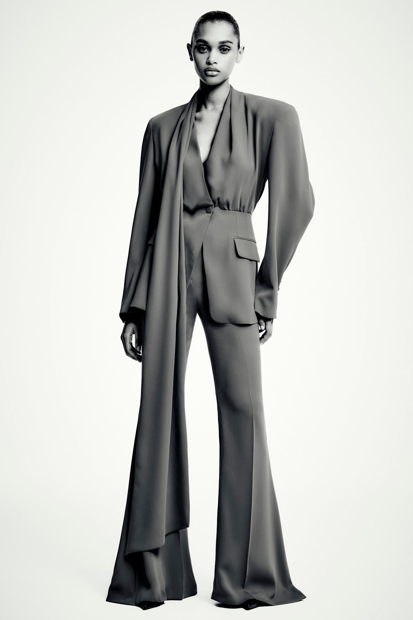 جامبسوت بتصميم انسيابي وأكتاف محددة تمنح القوام توازنًا أنيقًا، مع وشاح منسدل يضفي حركة رقيقة. إطلالة مناسبة لسهرات السحور التي تتطلب راحة وأناقة في آنٍ واحد.