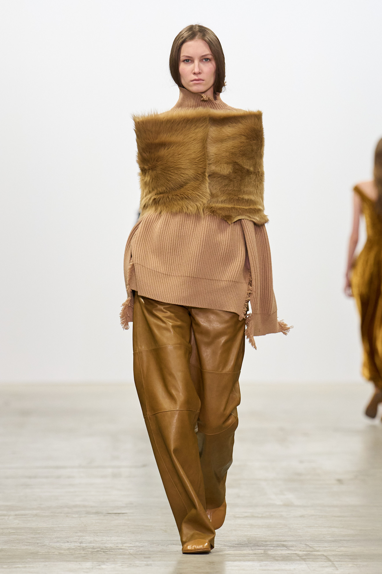 قدّمت فرانسيس هاوي مجموعة تؤكد قوة المرأة عبر خياطة دقيقة ومعاطف فضفاضة وفساتين مخملية بتصميم الساعة الرملية. تناغمت الأقمشة الثقيلة مع الساتان الرقيق، فيما خطفت المجوهرات البرونزية المنحوتة الأنظار بتفاصيلها النباتية المبتكرة.