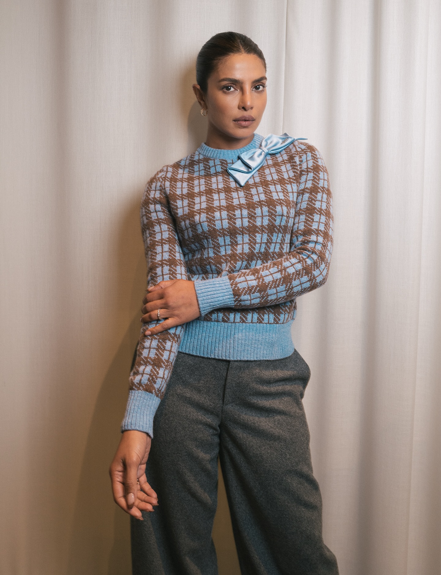 من دار Dior، أطلت بإطلالة راقية جمعت بين سترة صوفية بنقشة مربعات كلاسيكية بدرجات البني والأزرق السماوي، وسروال رمادي واسع بقصّة مستقيمة. ربطة العنق الصغيرة من القماش نفسه أضافت لمسة أنثوية ذكية، وكأنها تقول: التفاصيل الصغيرة تصنع الفرق الكبير.