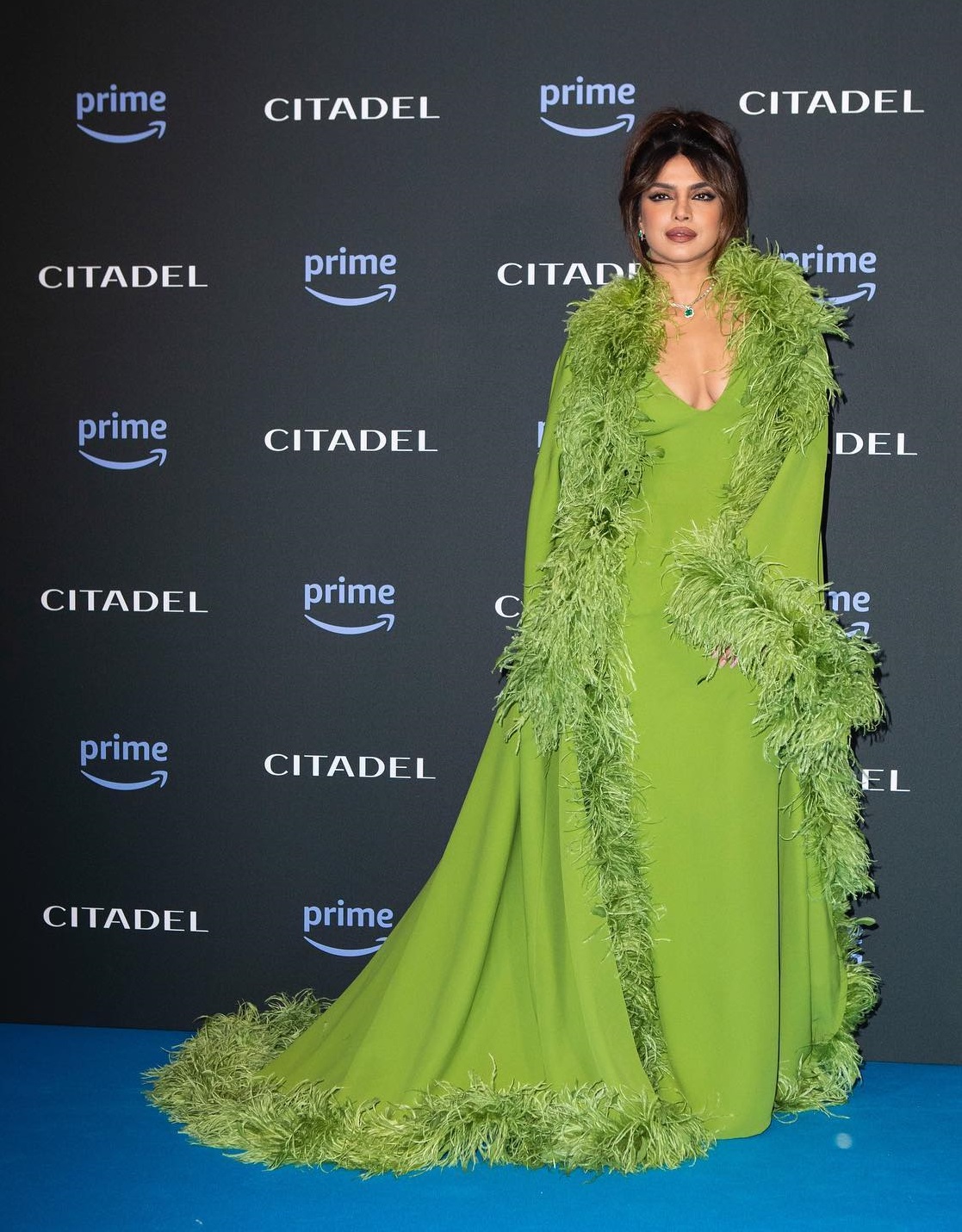 وفي ظهور آخر، تألقت بفستان أخضر مجسّم مع رداء طويل مزين بالريش، لتقدم درسًا في كيفية توظيف التفاصيل الملفتة دون أن تفقد الإطلالة وقارها.