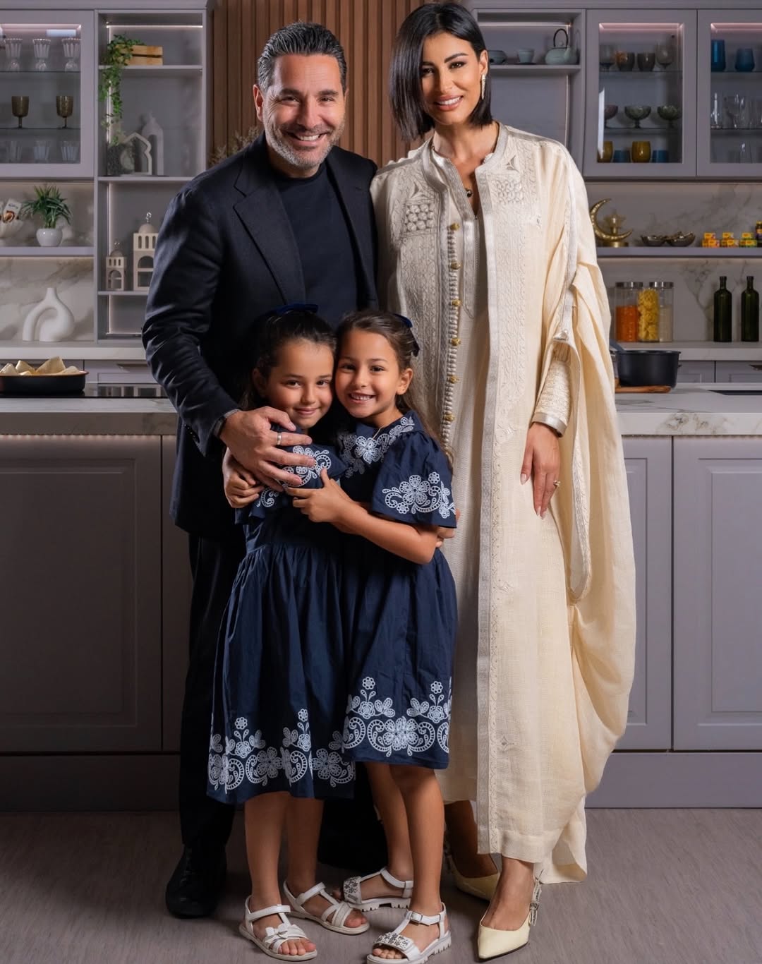 في لقطة عائلية مؤثرة، ظهرت ريم السعيدي بإطلالة مونوكروم راقية، مرتدية عباءة أوف وايت من الكتان الفاخر بتطريزات ناعمة وأزرار ذهبية. إلى جانبها زوجها وسام بريدي ببدلة سوداء كلاسيكية، بينما تألقت ابنتاهما بفساتين كحلية مطرزة بالأبيض.