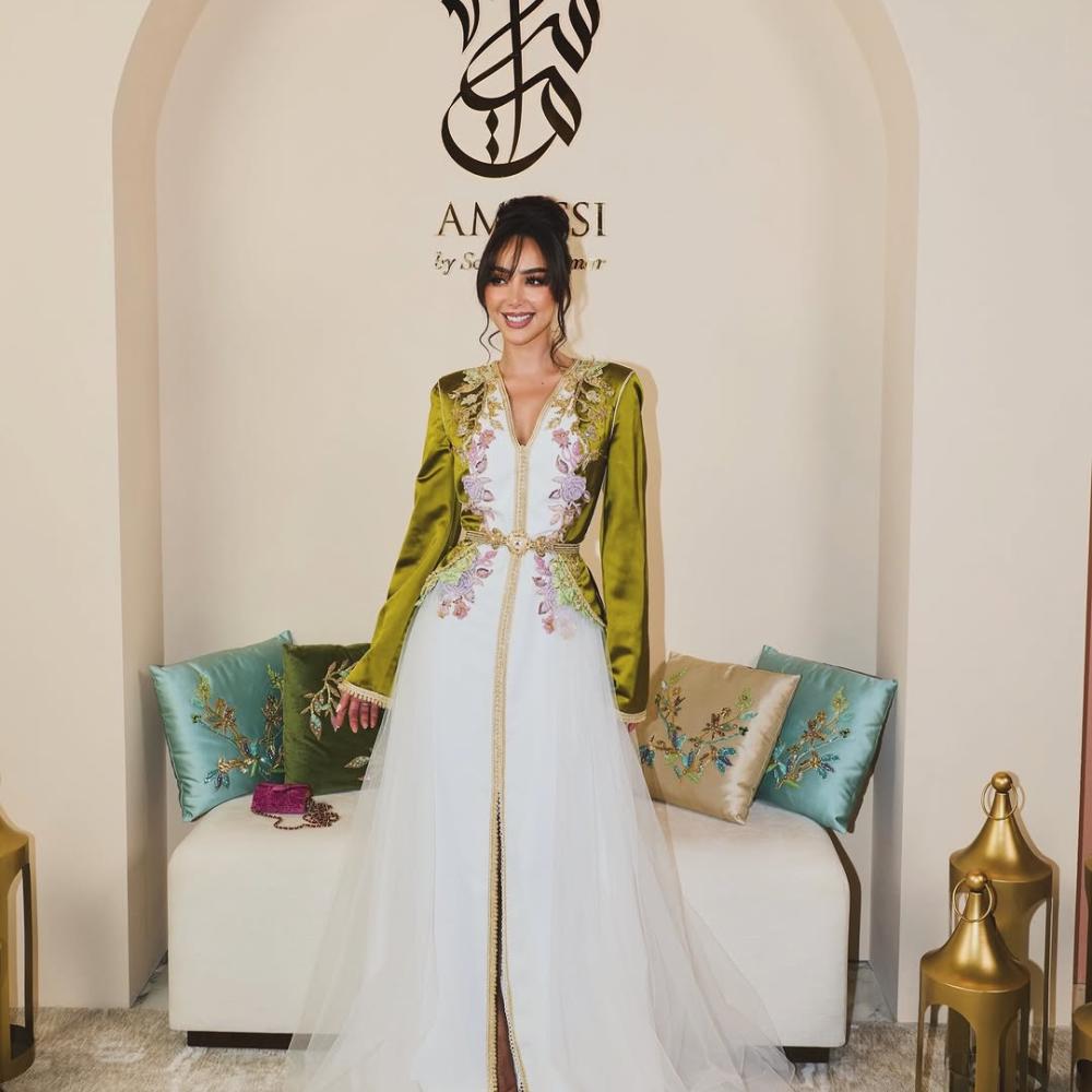اختارت بسمة بوسيل أن تستقبل رمضان بإطلالة مغربية بامتياز في أجواء دبي، حيث تألقت بقفطان من توقيع سلمى بنعمر جمع بين الأخضر الباستيلي في الجزء العلوي الحريري وتنورة بيضاء مكسوّة بطبقات التول الناعمة. التطريزات الربيعية الدقيقة زيّنت الصدر والخصر، فيما حدّد الحزام الذهبي قوامها برقي.