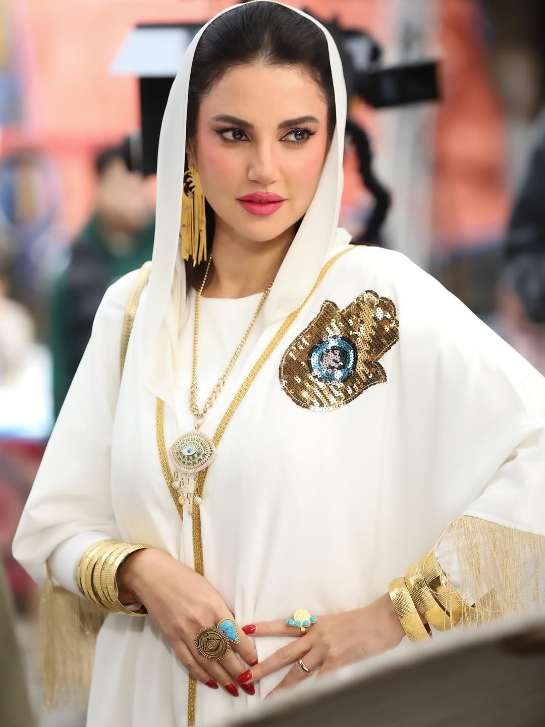 احتفلت درة بقدوم رمضان بمجموعة صور لإطلالات شرقية سابقة، كان أبرزها قفطان أبيض فضفاض مزين بلمسات ذهبية، يتوسطه رمز “الخميسة” المطرز بالترتر الذهبي، مع شراشيب حريرية تضيف حركة أنثوية لافتة.