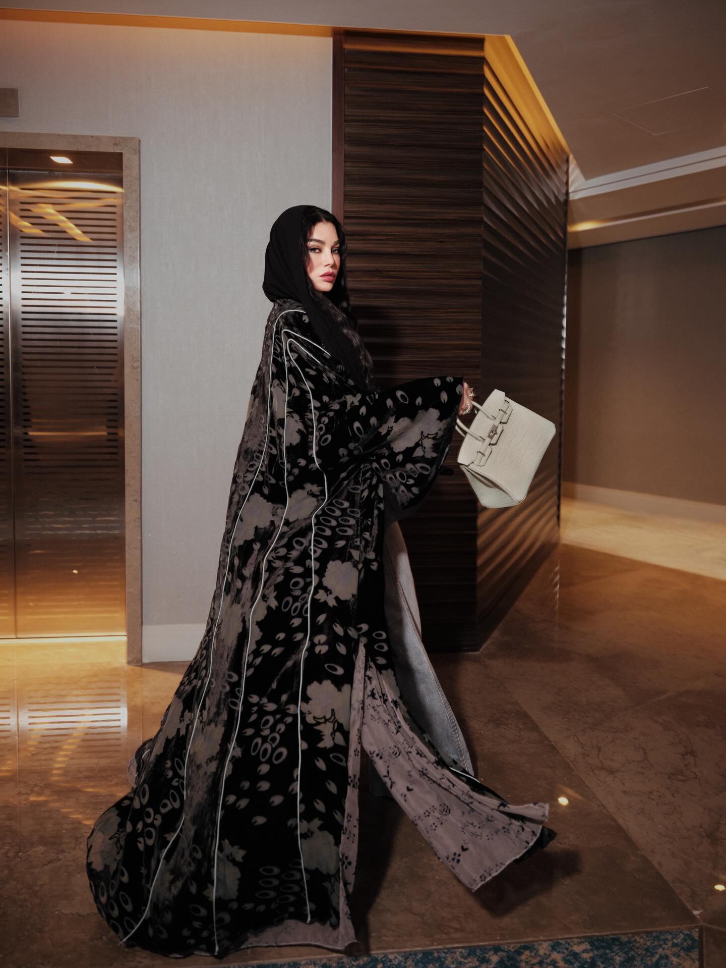 اختارت هيفاء عباية طويلة واسعة الأكمام، بتصميم فني يمزج بين الأسود والرمادي في تدرجات متداخلة ونقوش غير منتظمة، منحت القطعة طابعًا معاصرًا بعيدًا عن النمط التقليدي.