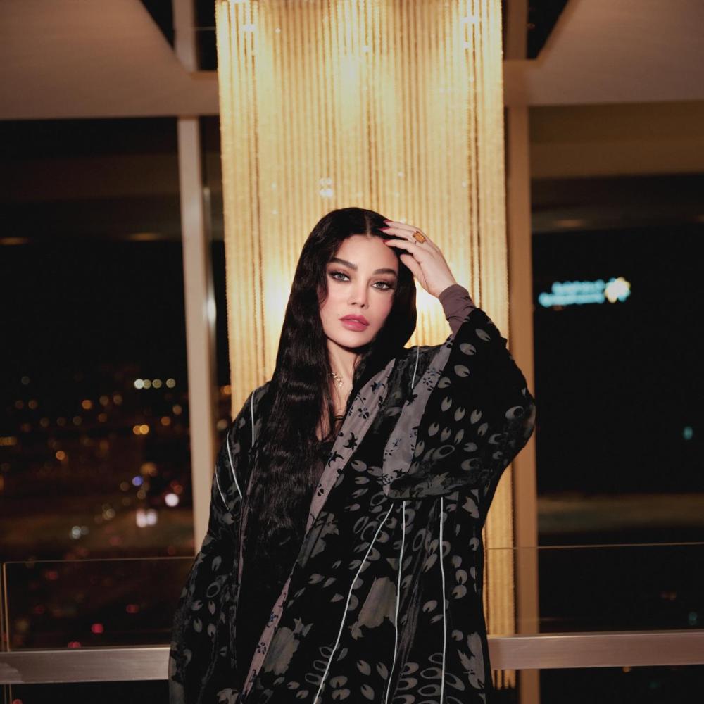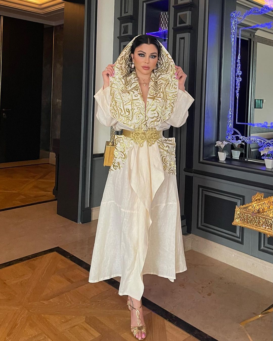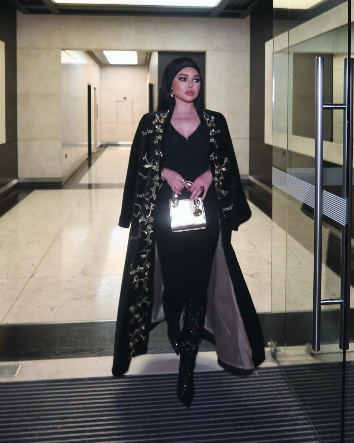 في ظهور آخر، اعتمدت سروالًا وتوبًا باللون الأسود ونسّقت فوقهما عباية مخملية مفتوحة مزينة بتطريزات ذهبية على شكل زهور صغيرة عند الأطراف. وأعادت إضافة اسمها على الظهر، إلى جانب عبارة “Diva Haifa” على أحد الأكمام، لتؤكد أن لمستها الخاصة جزء لا يتجزأ من التصميم.