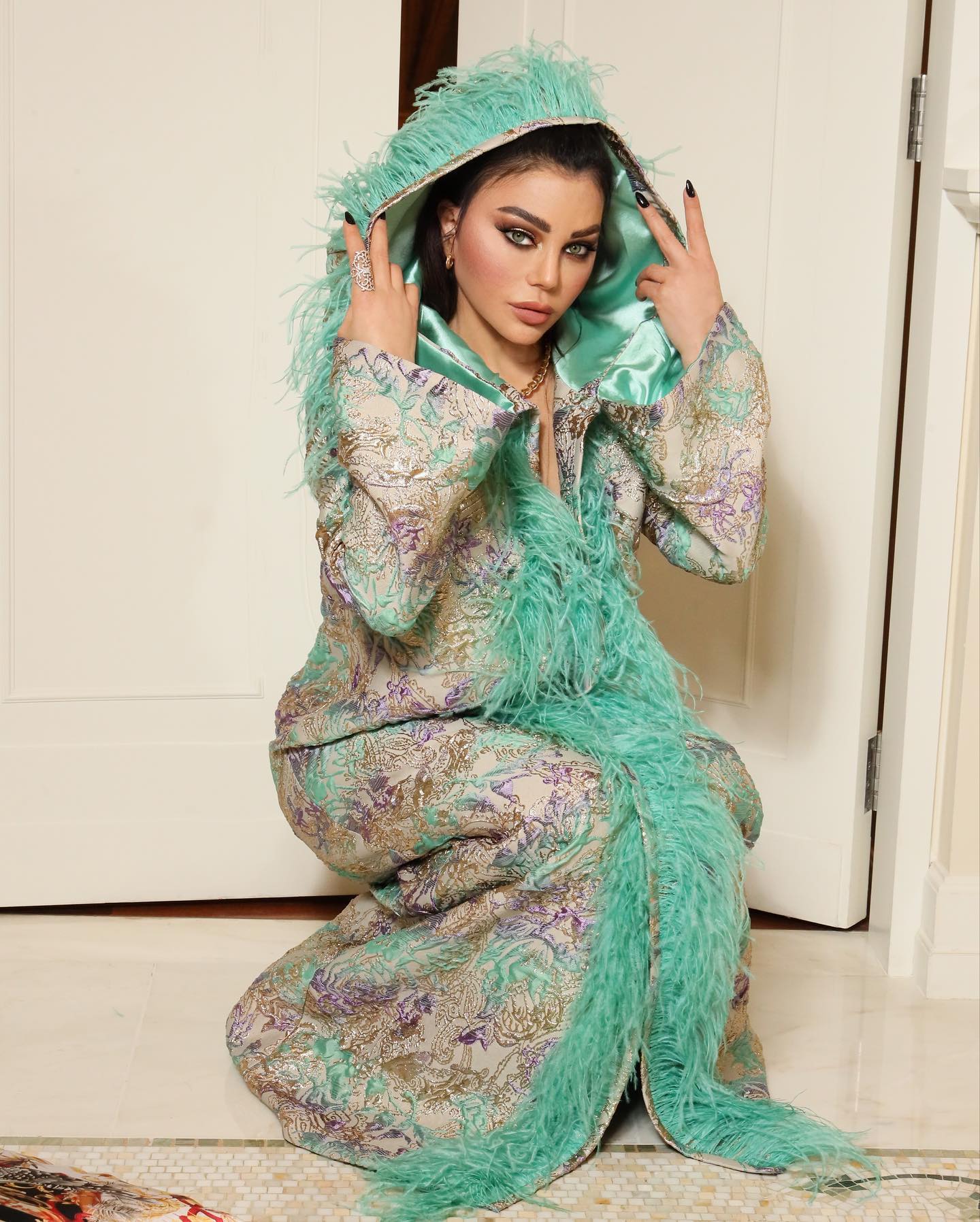 كما تألقت بعباية متدرجة بين الأخضر الباستيل والموف، تتخللها طبعات ذهبية، مع غطاء رأس وشراشيب ريش طويلة بلون أزرق مخضر امتدت على طول الفتحة وحتى الغطاء، في إطلالة جمعت الجرأة والاحتشام بأسلوب مدروس.