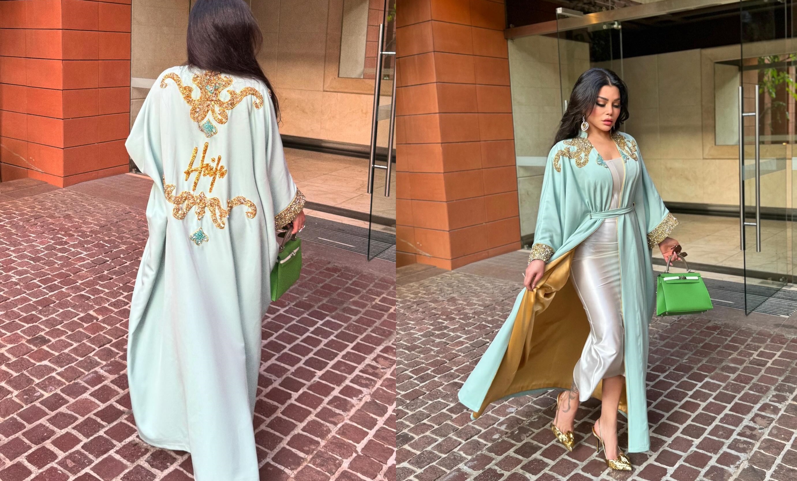 في إحدى الإطلالات، نسّقت فستانًا فضيًا ضيقًا مع عباية سماوية مبطنة بالذهبي، مزينة بتطريزات براقة على الأكمام والكتفين، وحزام يحدد الخصر. اللافت كان تطريز اسمها على الظهر بخيوط ذهبية تحيط به زخارف تركوازية، في حركة تؤكد حبها للتفاصيل الشخصية.