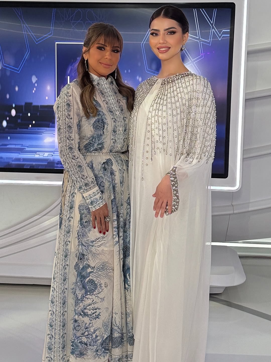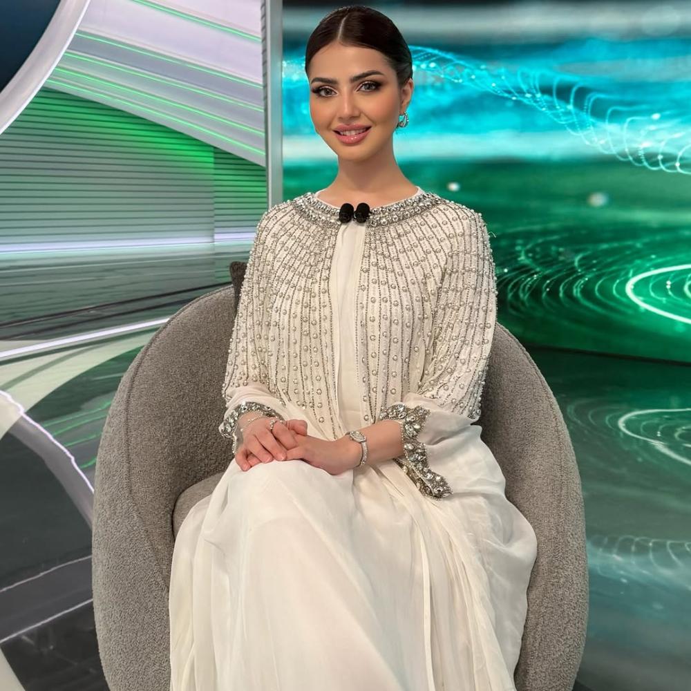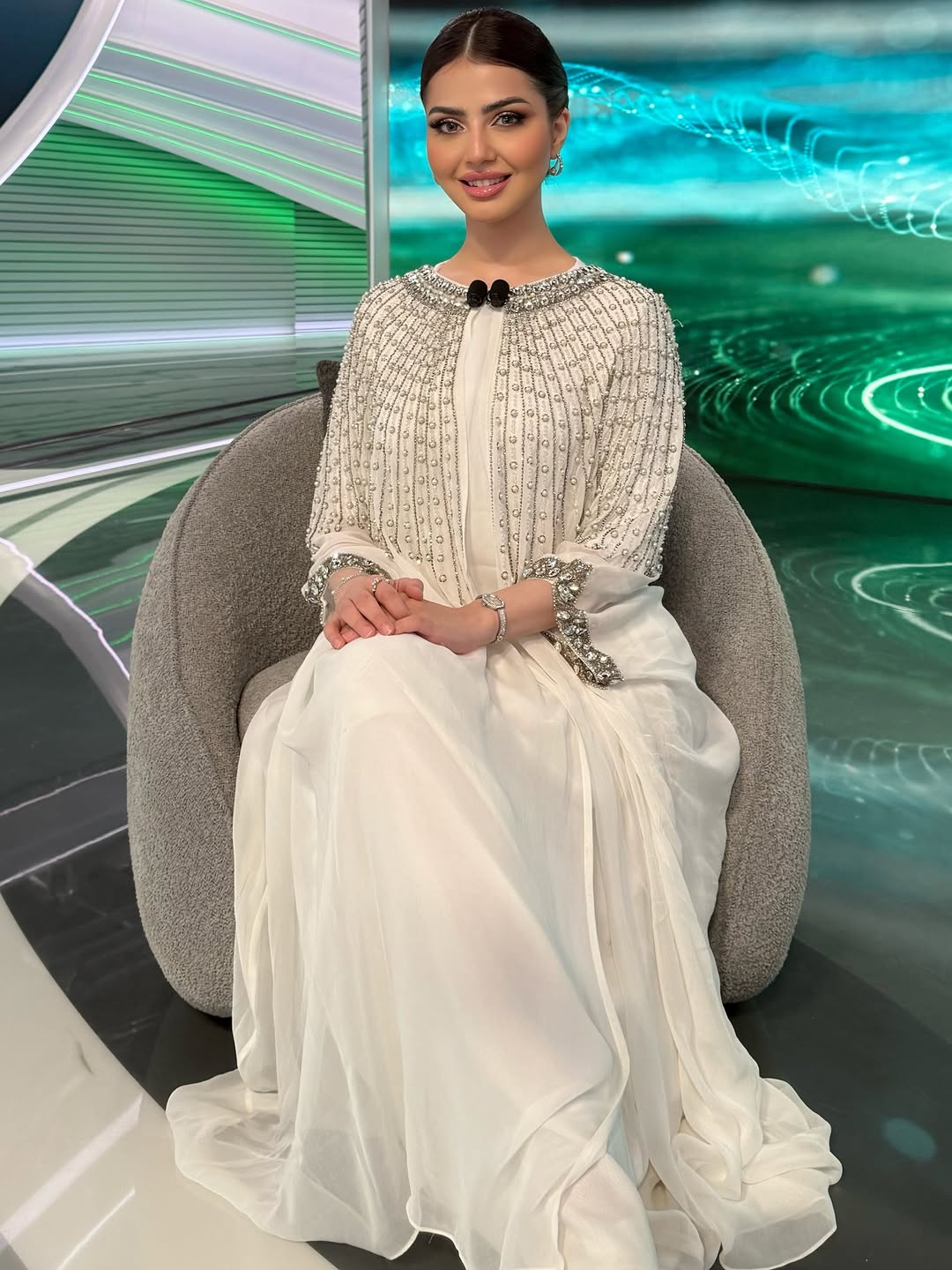 خلال ظهورها في برنامج تفاعلكم، تألقت نرمين بقفطان أبيض من دار Shalky للمصمم قاسم القاسم. التصميم جاء بقماش شيفون منسدل مع “كيب” قصير مرصع باللؤلؤ والكريستال، ما أضفى بريقًا راقيًا من دون مبالغة. اختيار موفق لإفطار عائلي أو مناسبة تتطلب شياكة هادئة… فالأبيض في رمضان لا يخذلك أبدًا.