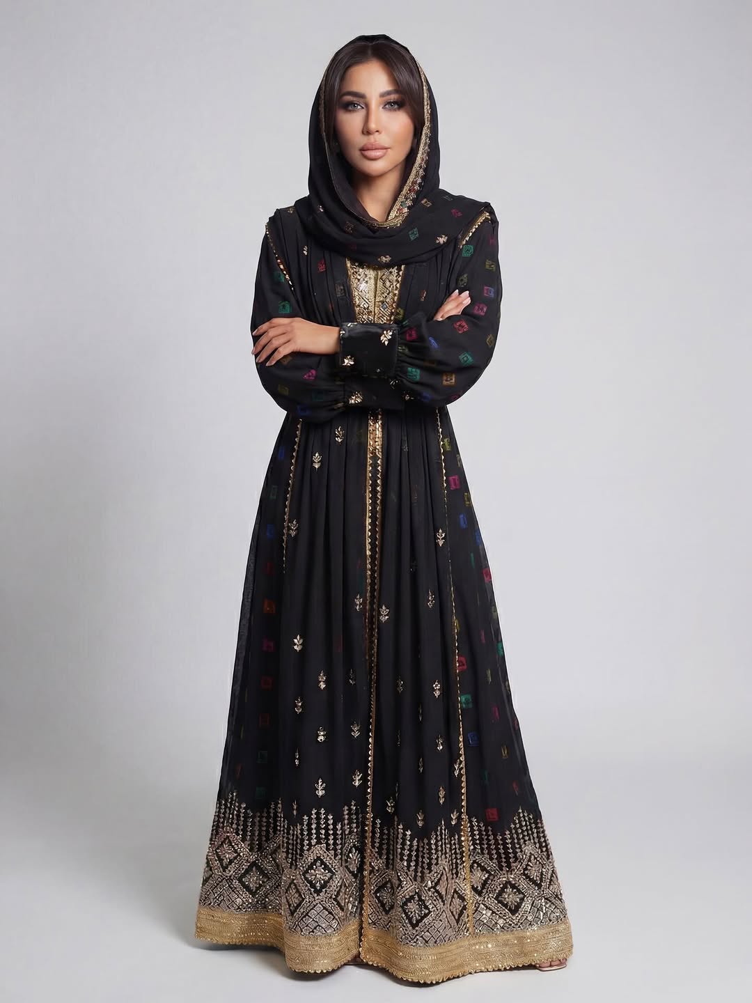 قدمت مريم عباءة من تصميم Sanah Yasin بمزيج بين الحرير والمخمل بدرجات البني والبرونزي. التطريزات النحاسية النافرة أضافت بعدًا ثلاثي الأبعاد، فيما منح الوشاح بأسلوب “هود” الإطلالة طابعًا عصريًا مميزًا. هذه الإطلالة تناسب الغبقات والسحورات المتأخرة التي تتطلب حضورًا لافتًا دون صخب.