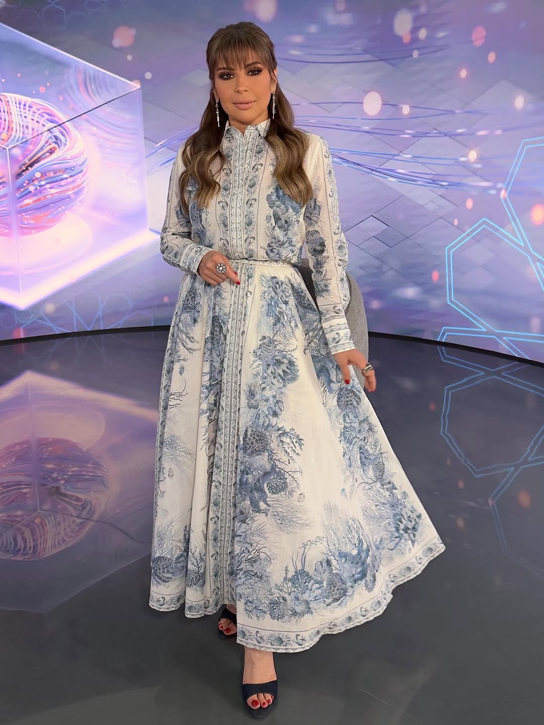 ابتعدت سارة عن القفطان التقليدي، واختارت فستانًا ميدي بستايل العباءة من دار Rubaiyat، بنقشة “Toile de Jouy” بالأبيض والأزرق السماوي. القصة ذات الياقة المرتفعة وتحديد الخصر منحتها مظهرًا عمليًا وأنيقًا في آن. خيار مناسب لإفطار عمل أو لقاء رمضاني سريع بإيقاع عصري.