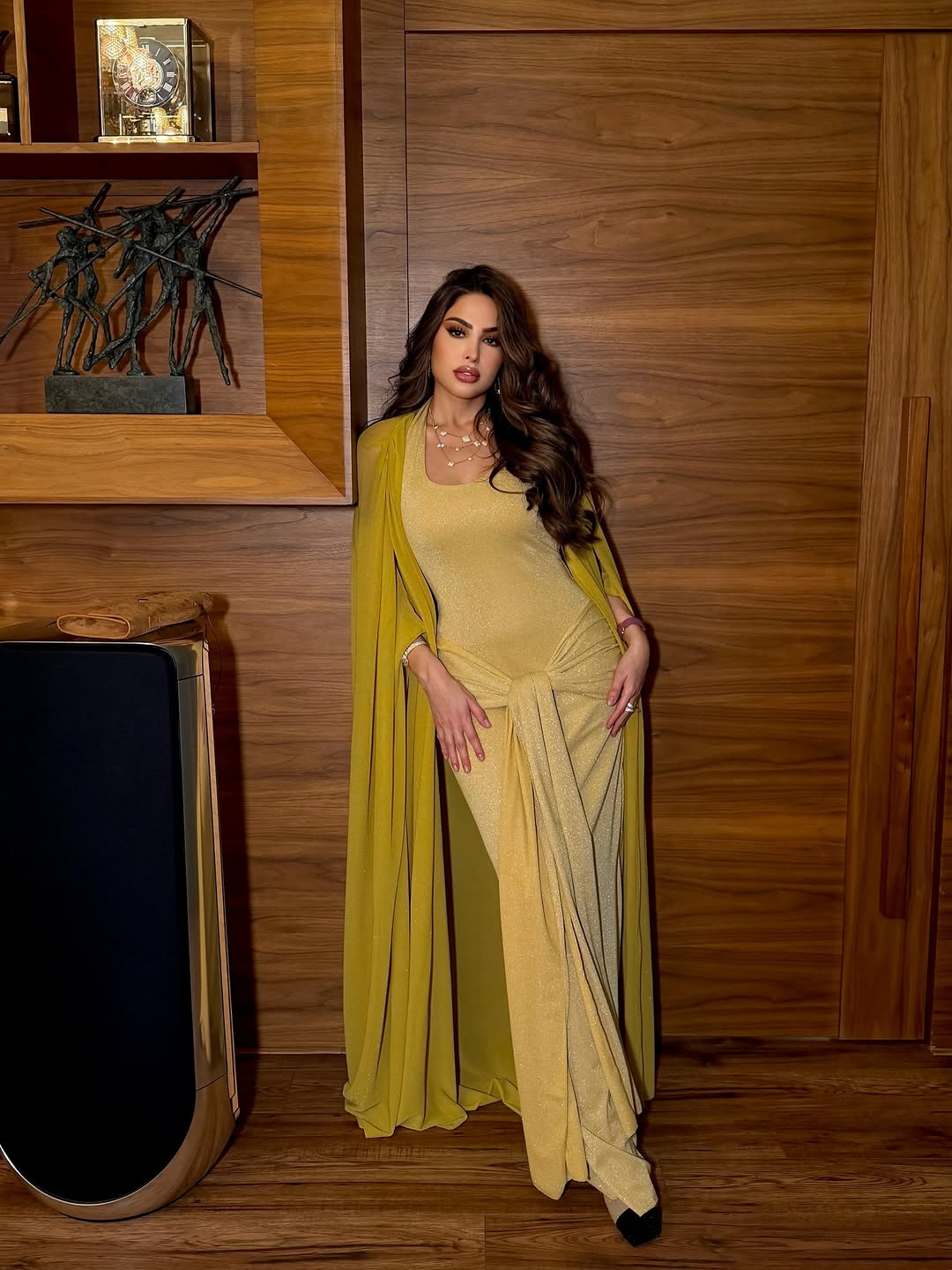 أما فوز الفهد فاختارت إطلالة “مونوكروم” باللون الأصفر الذهبي، بفستان طويل مع عقدة عند الخصر و”كيب” شيفون من الدرجة نفسها. جرأة اللون منحتها إشراقة لافتة تناسب سهرات رمضان، خاصة لمن تحب الألوان الحيوية وتؤمن أن الأناقة لا تعني دائمًا الألوان الهادئة.