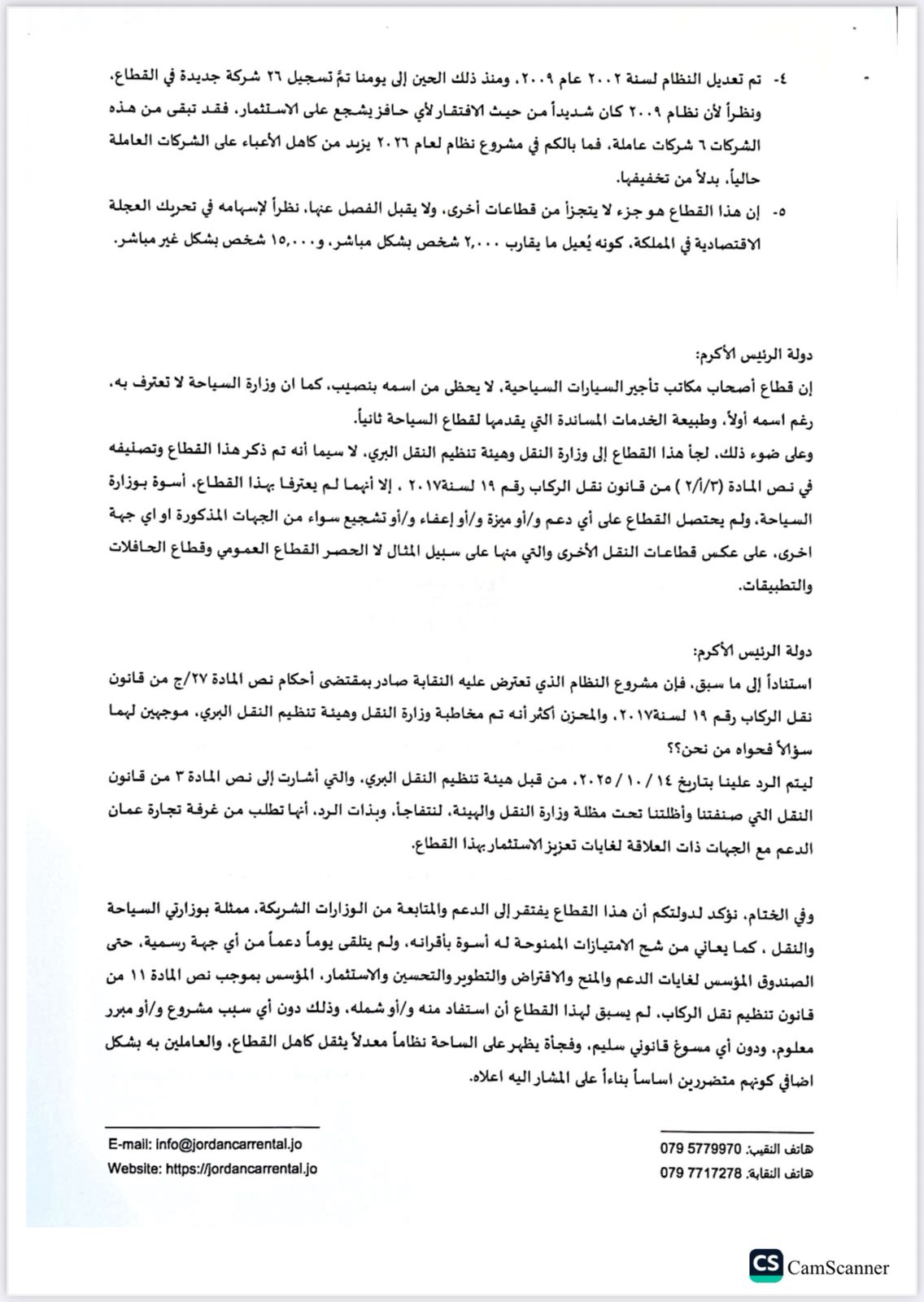 وبينت أن مشروع النظام الذي تعترض عليه النقابة صادر بمقتضى أحكام نص المادة ٢٧/ج من قانون نقل الركاب رقم ۱۹ لسنة ۲۰۱۷، والمحزن أكثر أنه تم مخاطبة وزارة النقل وهيئة تنظيم النقل البري، موجهين لهما سؤالاً فحواه من نحن؟ ليتم الرد عليه بتاريخ ١٤ / ١٠ / ٢٠٢٥، من قبل هيئة تنظيم النقل البري، والتي أشارت إلى نص المادة 3 من قانون النقل "التي صنفتنا وأظلتنا تحت مظلة وزارة النقل والهيئة، لنتفاجأ، وبذات الرد، أنها تطلب من غرفة تجارة عمان الدعم مع الجهات ذات العلاقة لغايات تعزيز الاستثمار بهذا القطاع".