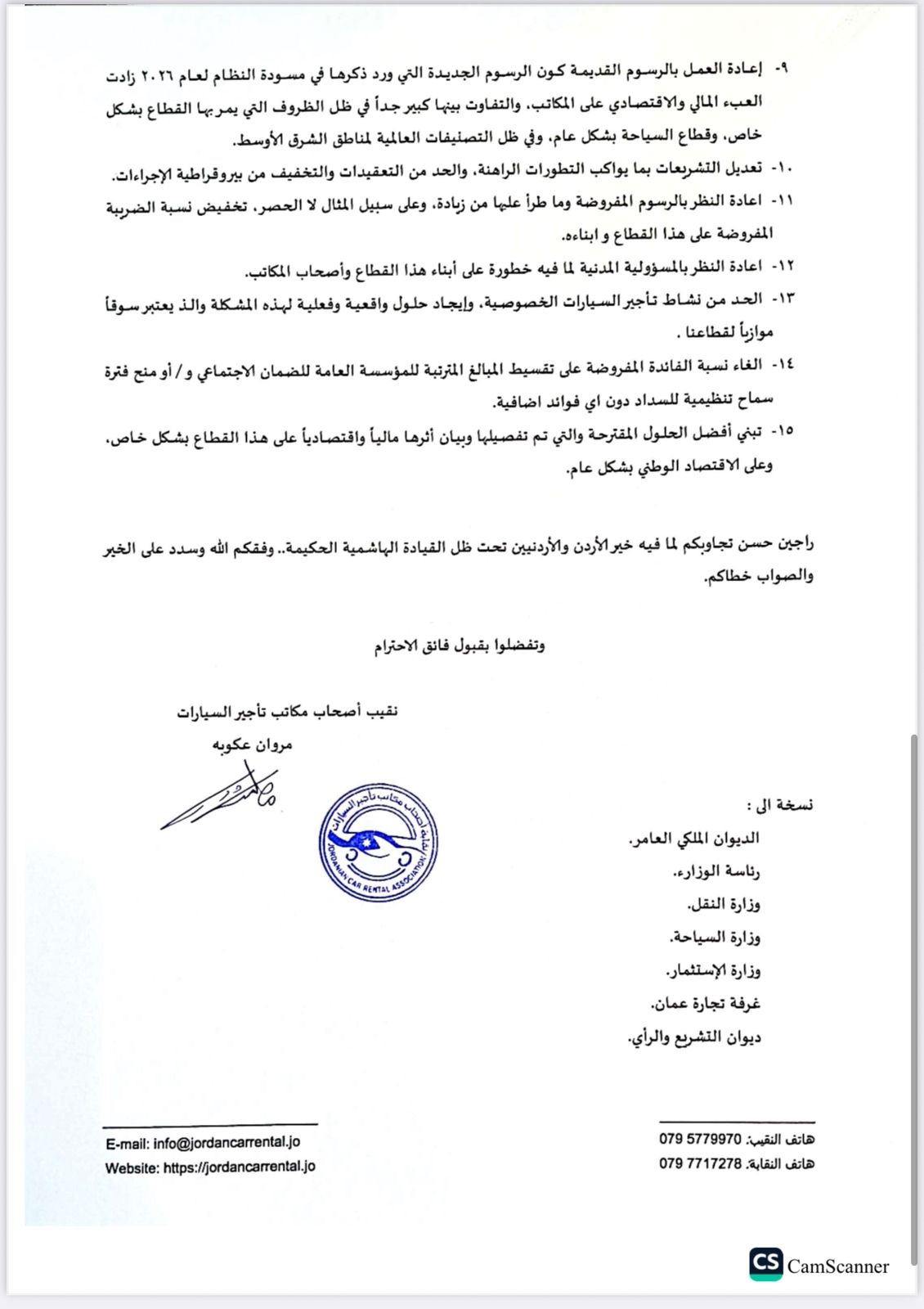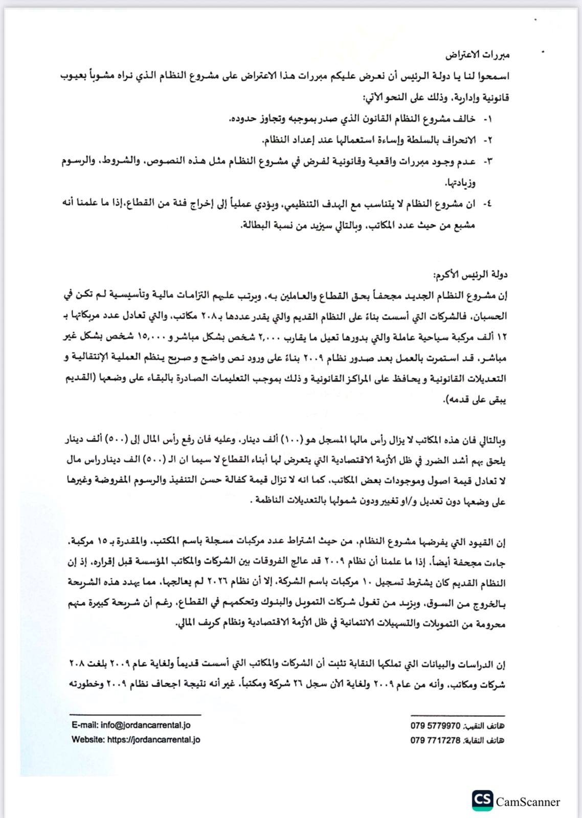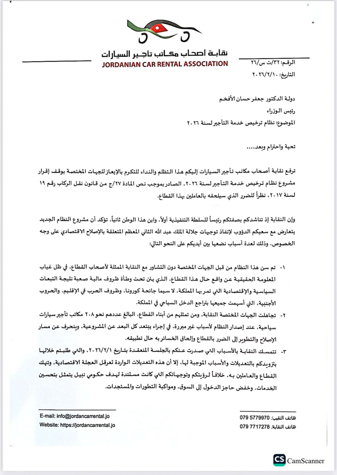 للعلّم - وجهت نقابة اصحاب مكاتب تأجير السيارات كتاب تظلم ونداء إلى رئيس الوزراء الدكتور جعفر حسان، احتجاجا على مسودة نظام ترخيص خدمة التأجير لسنة ٢٠٢٦.