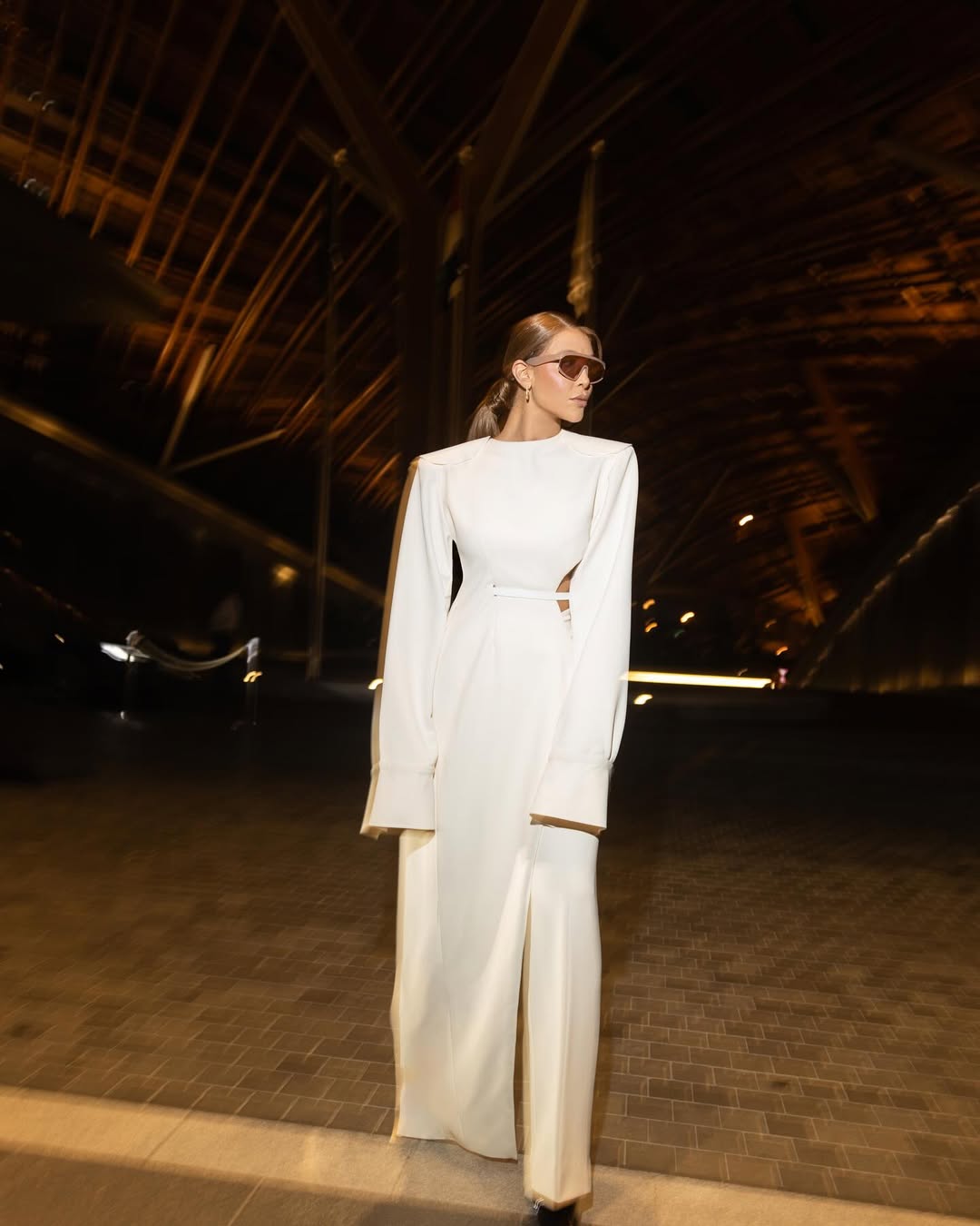 في Dubai Fashion Week، ظهرت نور بفستان أبيض طويل من توقيع Designers & Us، حمل طابعًا هندسيًا مع أكتاف بارزة وأكمام طويلة جدًا. فتحة جانبية عند الخصر أضفت حيوية على التصميم، بينما منحت القصّة العامة حضورًا قويًا.
