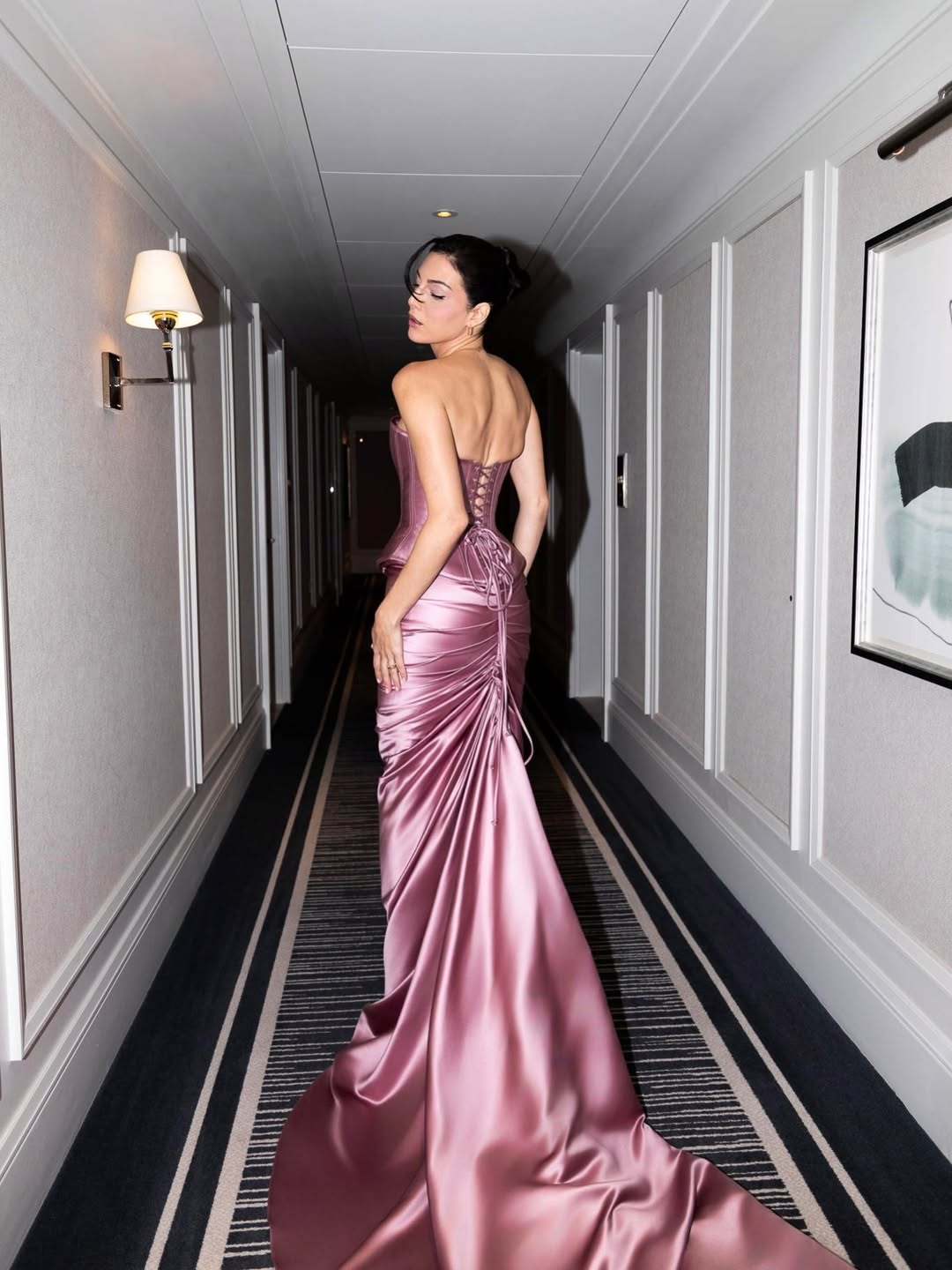 الكورسيه الهندسي حدد الخصر ببراعة، بينما انسدلت التنورة بذيل طويل فاخر. تسريحة الشينيون والمكياج الوردي الهادئ أكدا أناقة متوازنة بين العصرية والكلاسيكية.