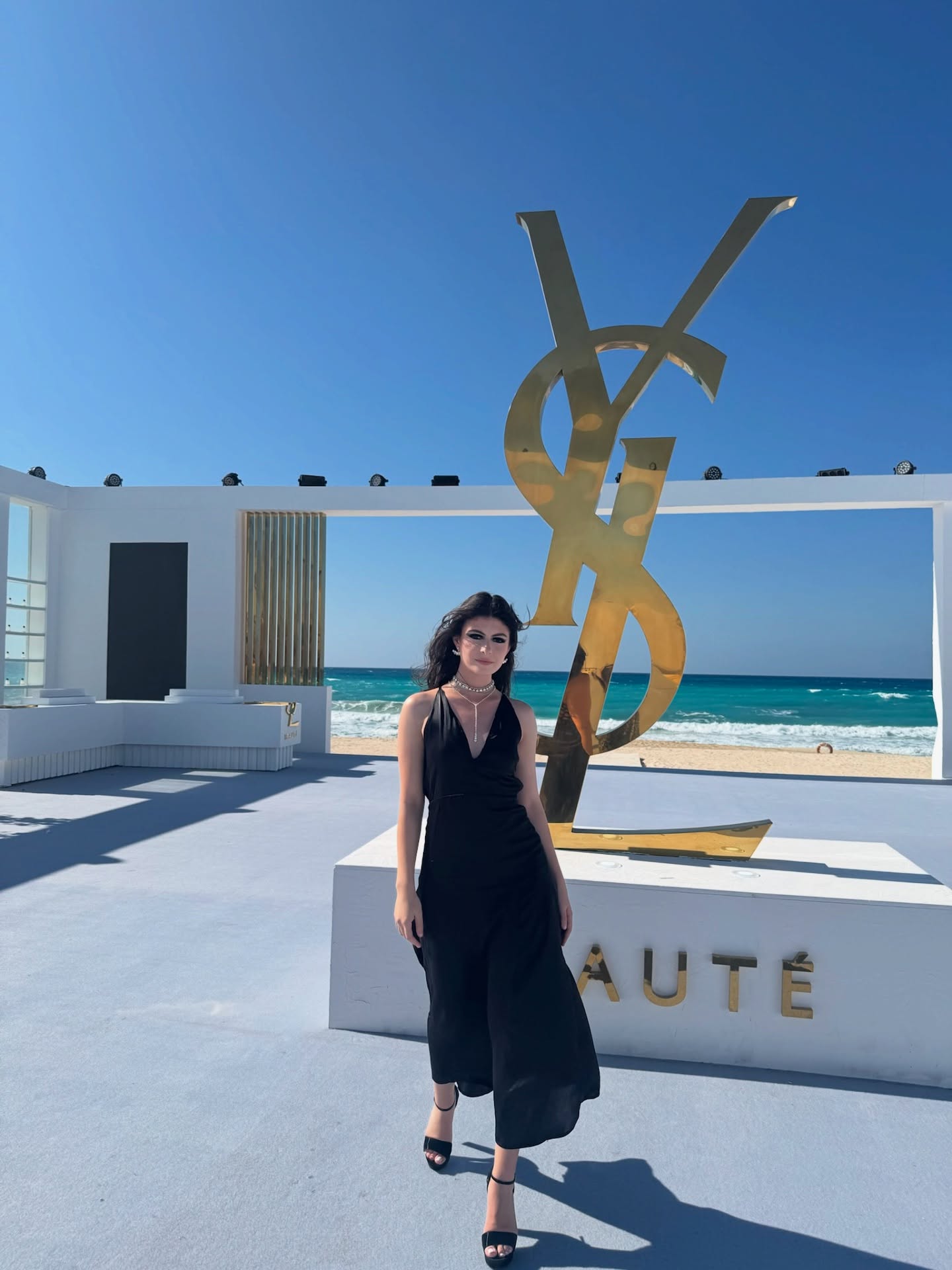 ظهرت بتصميم من Edeline Lee جمبسوت كحلي مخطط بخطوط بيضاء طولية، بقصة غير متماثلة تكشف عن كتف واحد مع كم طويل منسدل. الحزام الرفيع أبرز الخصر، فيما أكملت الإطلالة بنظارات شمسية عصرية.