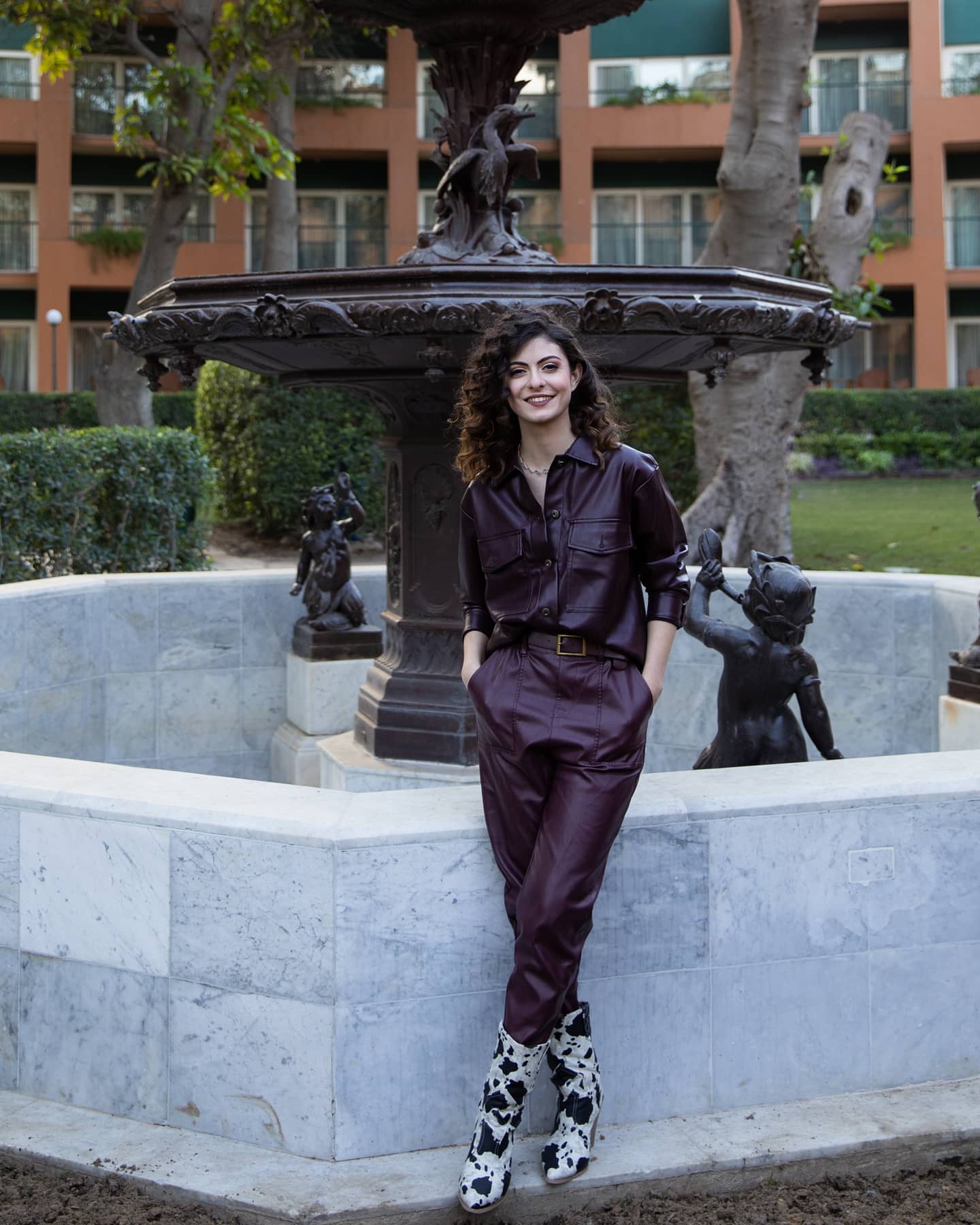 كما لفتت الأنظار بجمبسوت جلدي مستقيم باللون العنّابي، مع حزام يحدد الخصر وحذاء بطبعات جلد البقر. مزيج جريء يوازن بين الكلاسيكية والحداثة.