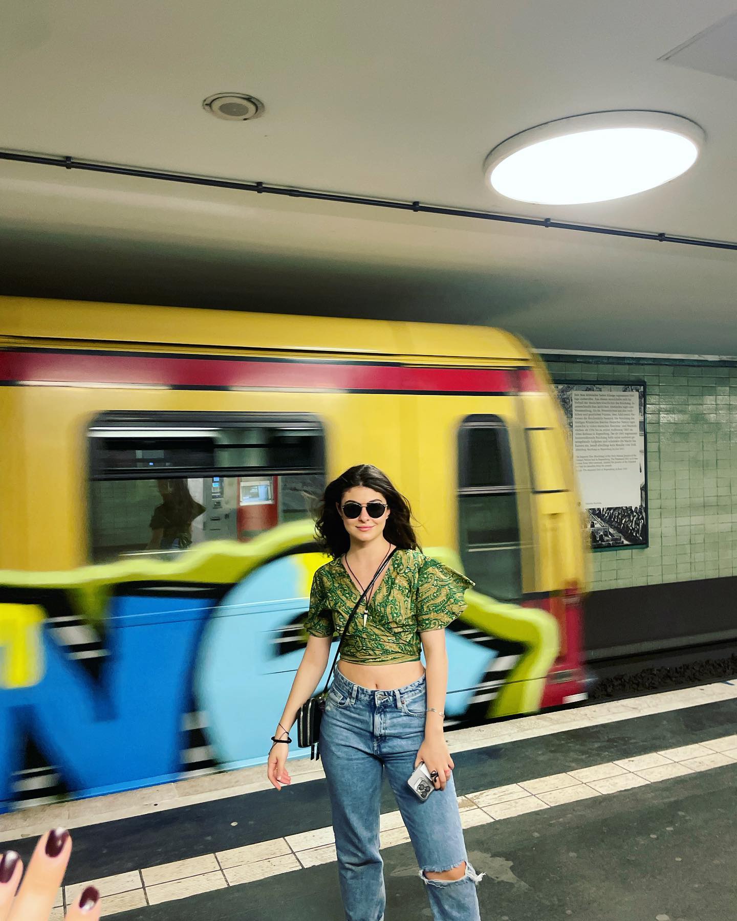 اعتمدت بلوزة قصيرة خضراء بتفاصيل ملتفة عند الخصر مع جينز أزرق ممزق عند الركبة. أضافت حقيبة صغيرة متقاطعة ونظارات شمسية دائرية، فبدت الإطلالة عفوية ومناسبة ليوم حافل بالحركة.