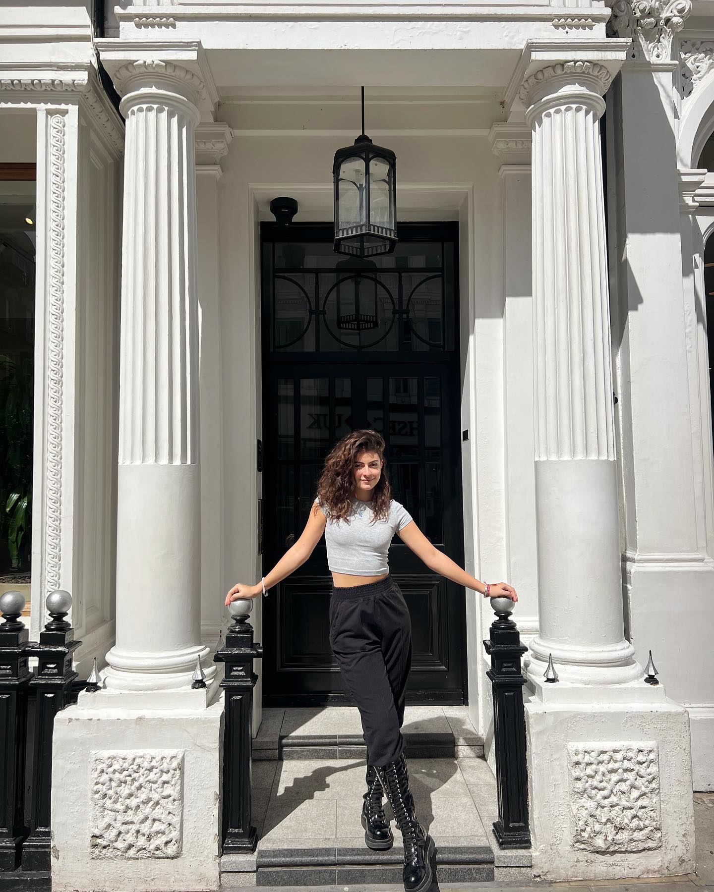 في إحدى رحلاتها، نسقت توبًا رماديًا قصيرًا مع بنطال رياضي أسود ضيق عند الكاحل، وأكملت اللوك بحذاء جلدي قتالي أسود.