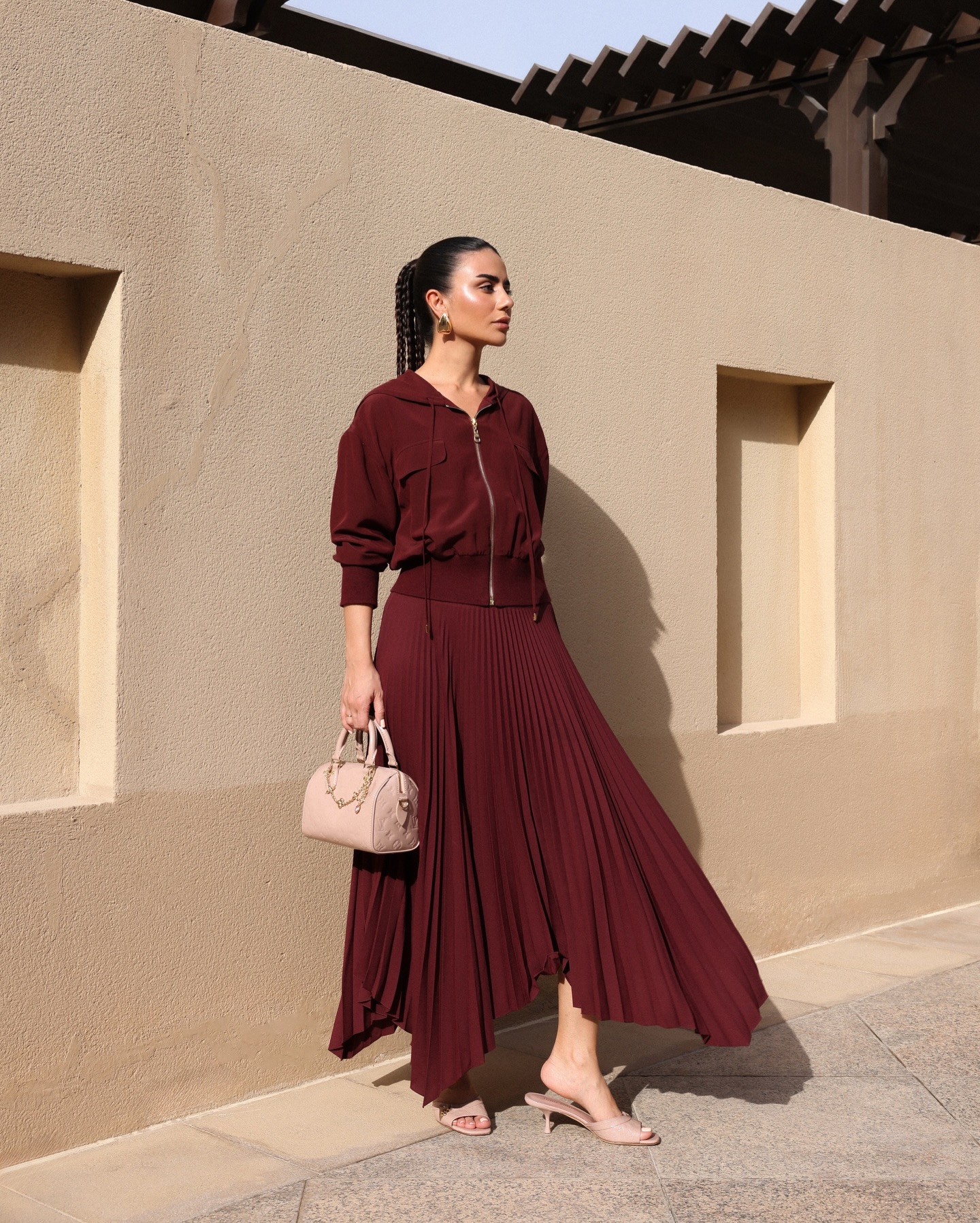 اختارت ديما تنورة بليسيه بلون برغندي مع سترة خفيفة من القماش نفسه، تصميم عملي يمنحها عصرية مريحة. الحقيبة الوردية الفاتحة أضافت توازناً ناعماً، فيما أكمل الصندل الحيادي الطابع الهادئ. إطلالة تقول ببساطة: الأناقة ليست حكراً على المساء.